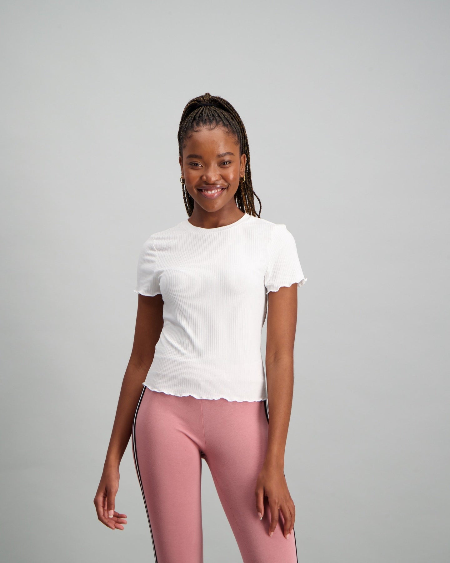 Features: Lettuce edge sleeve and bottom hem trims, ribbed material and cropped design.