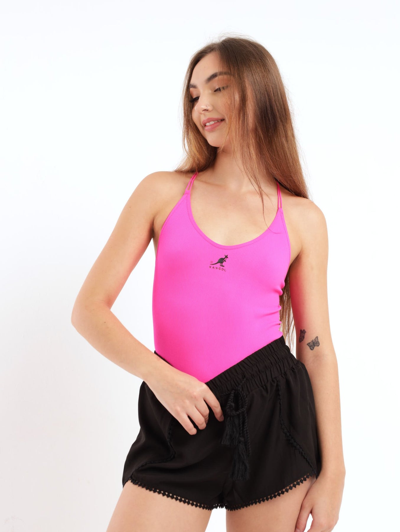 Ladies Low Plunge Cross-Over Ribbed Bodysuit - Bright Pink
