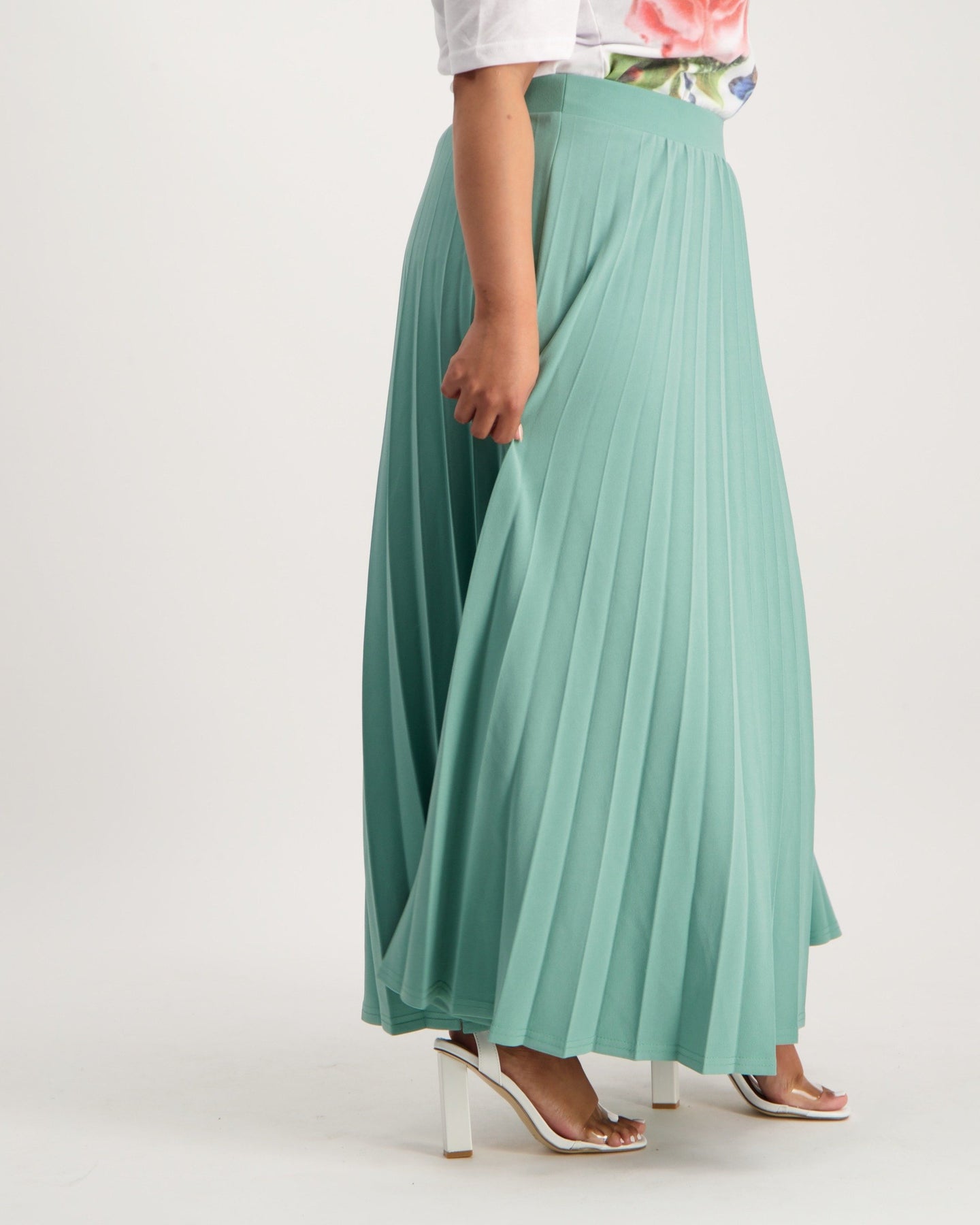 Features: Elasticated waistband, stretchy material and sunray pleats.