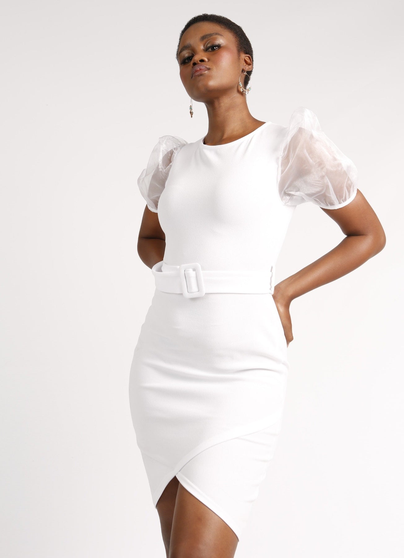 Ladies Puff Sleeve Belted Bodycon Dress - White
