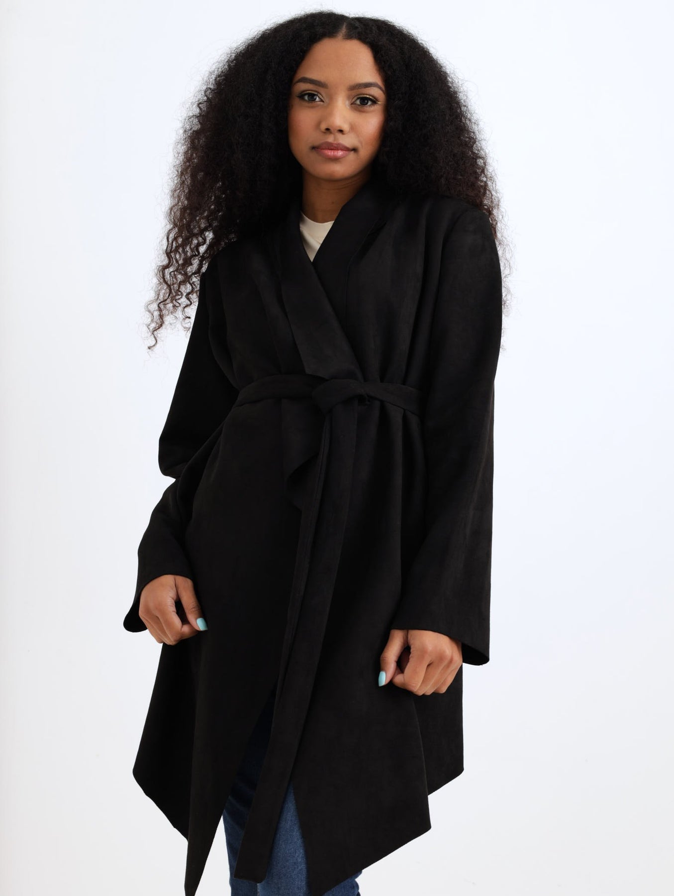 Ladies Tie Belt Suede Waterfall Jacket - Black