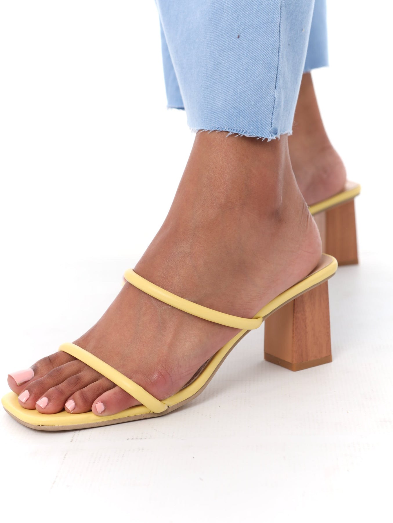 Ladies Tubular Double Strap Mid Wood Block Heel - Light Yellow
