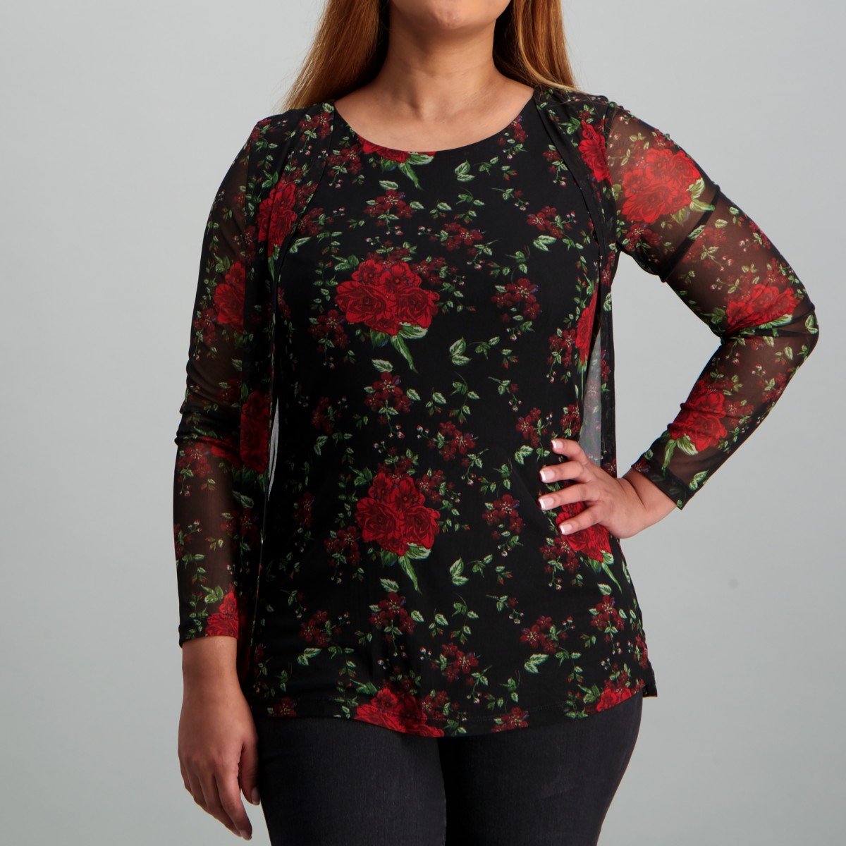 Features: Top with built in cardigan, round neckline, sheer sleeves and rose print design.