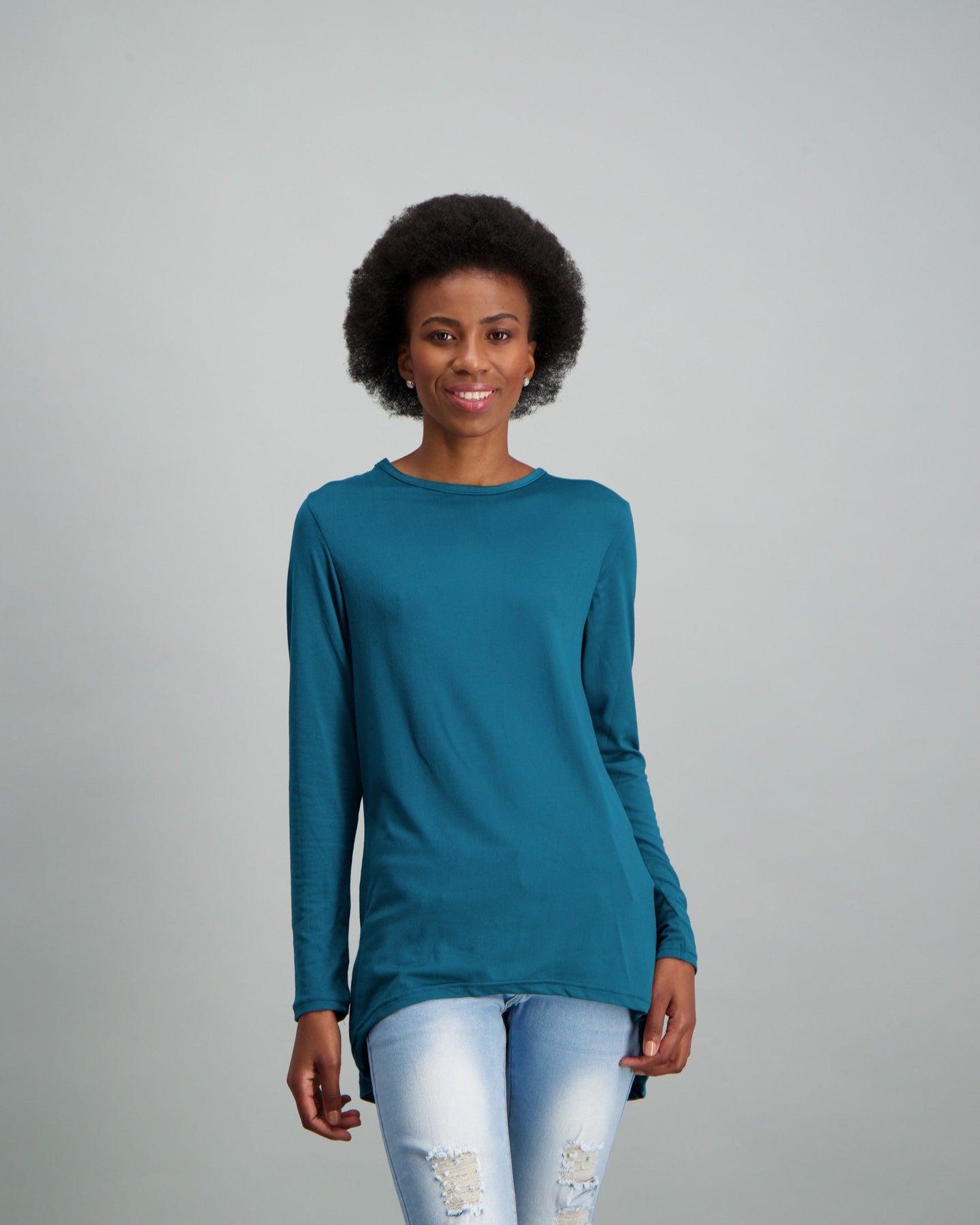 Not your everyday basic . This long sleeve stretchy tee offers a longer length style and a soft feel for a flattering fit. Style with a coat ,over tights and with ankle boots for an effortless casual weekend look.