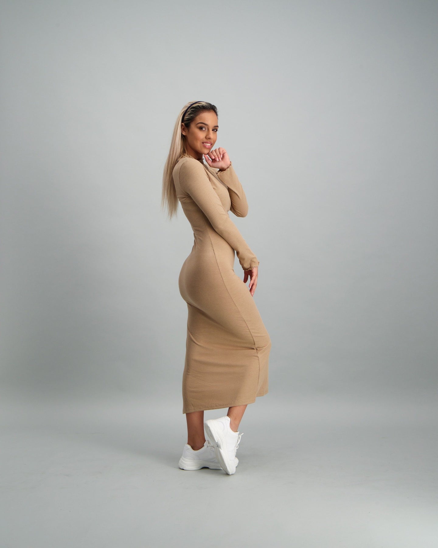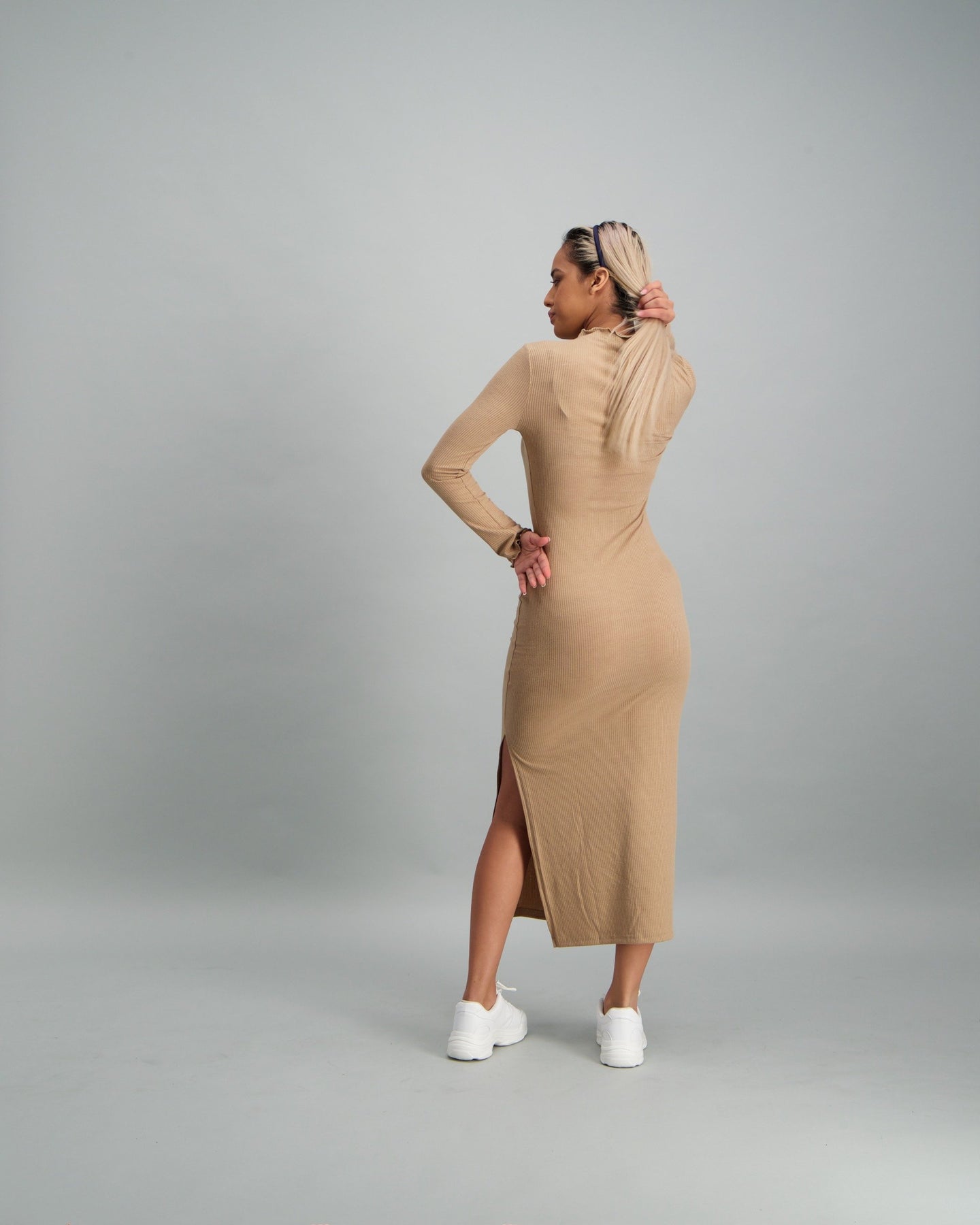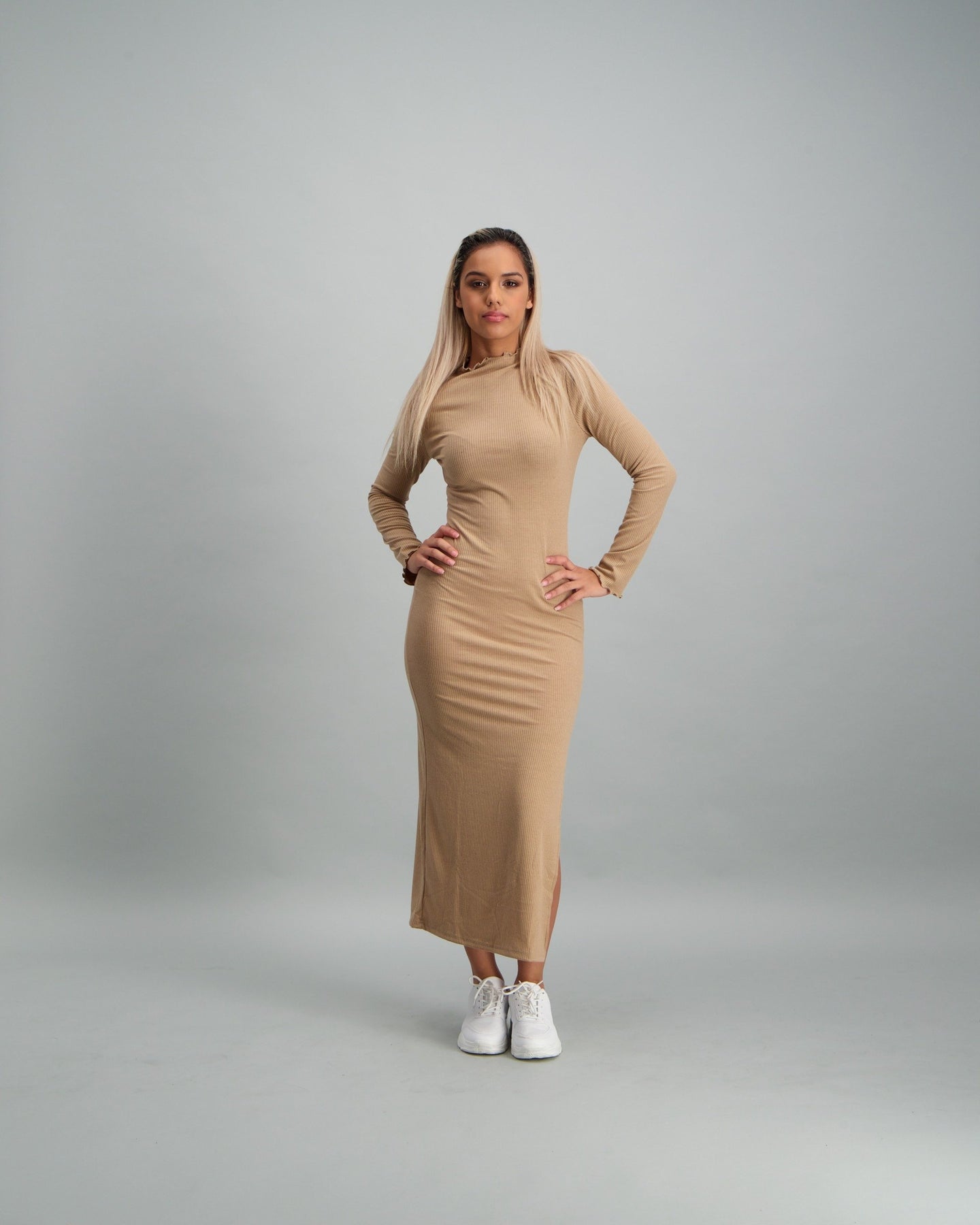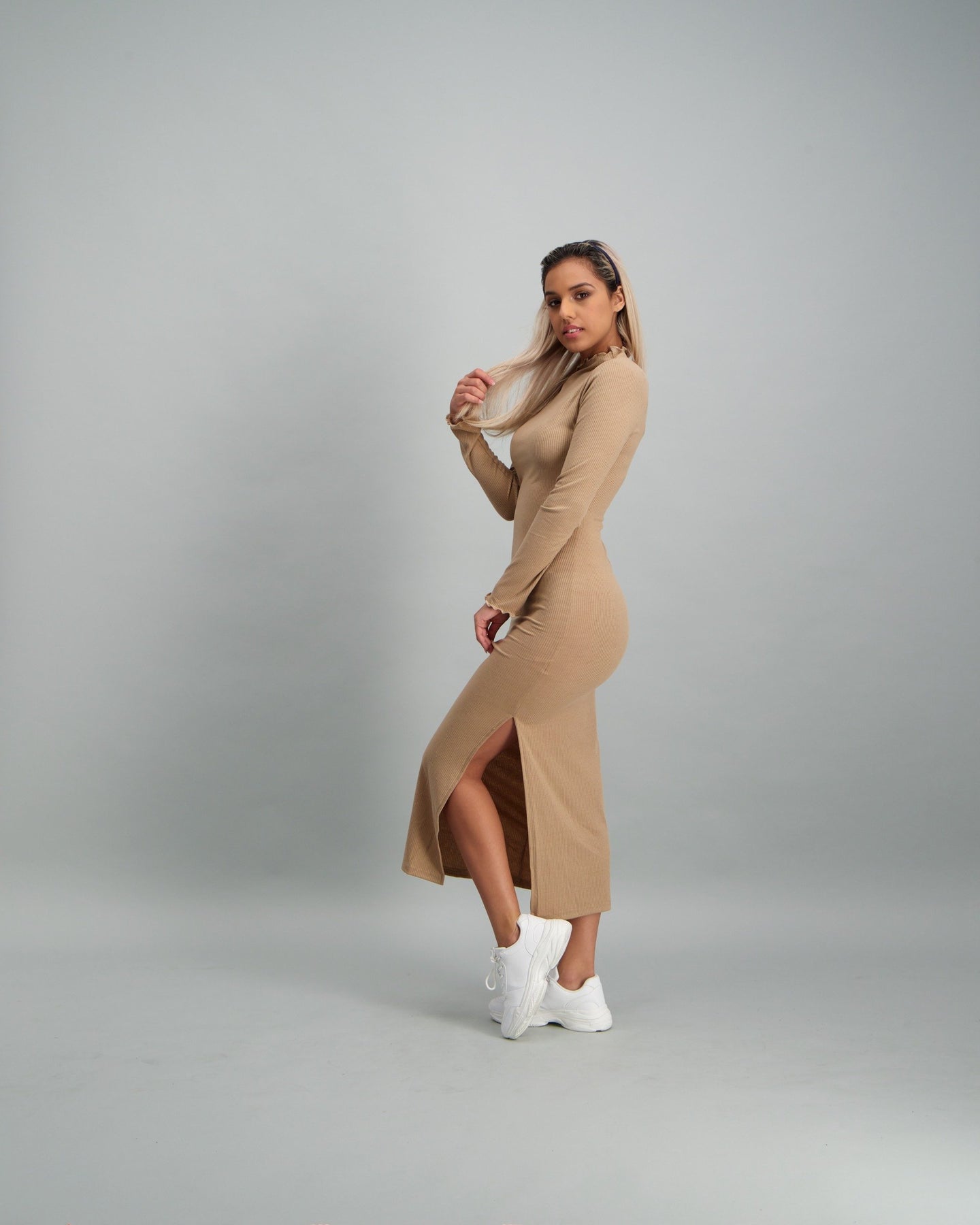 Features: Lettuce trim collar and sleeve hems, stretchy ribbed material, midi length and a side slit.