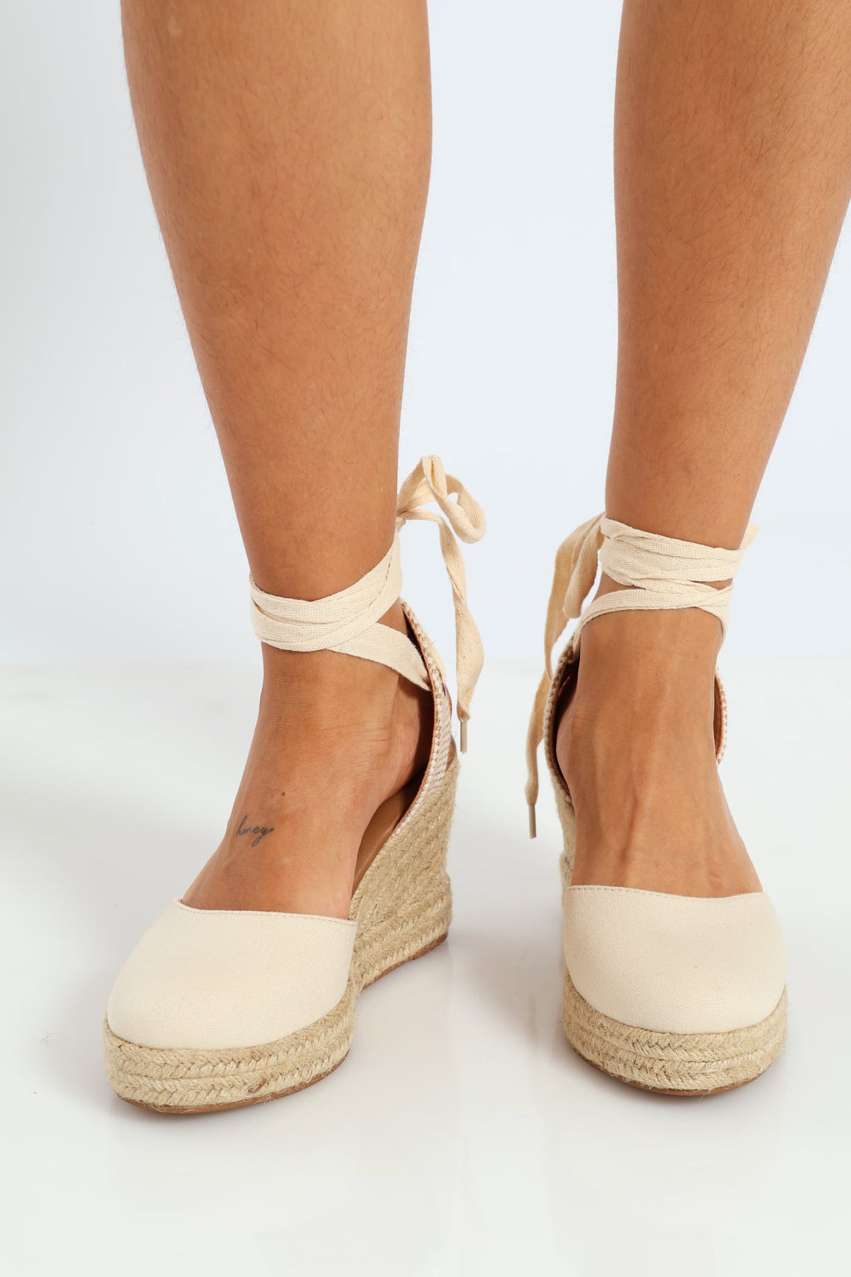 Leena Closed Toe Tying Strap Espadrille Heel - Neutral