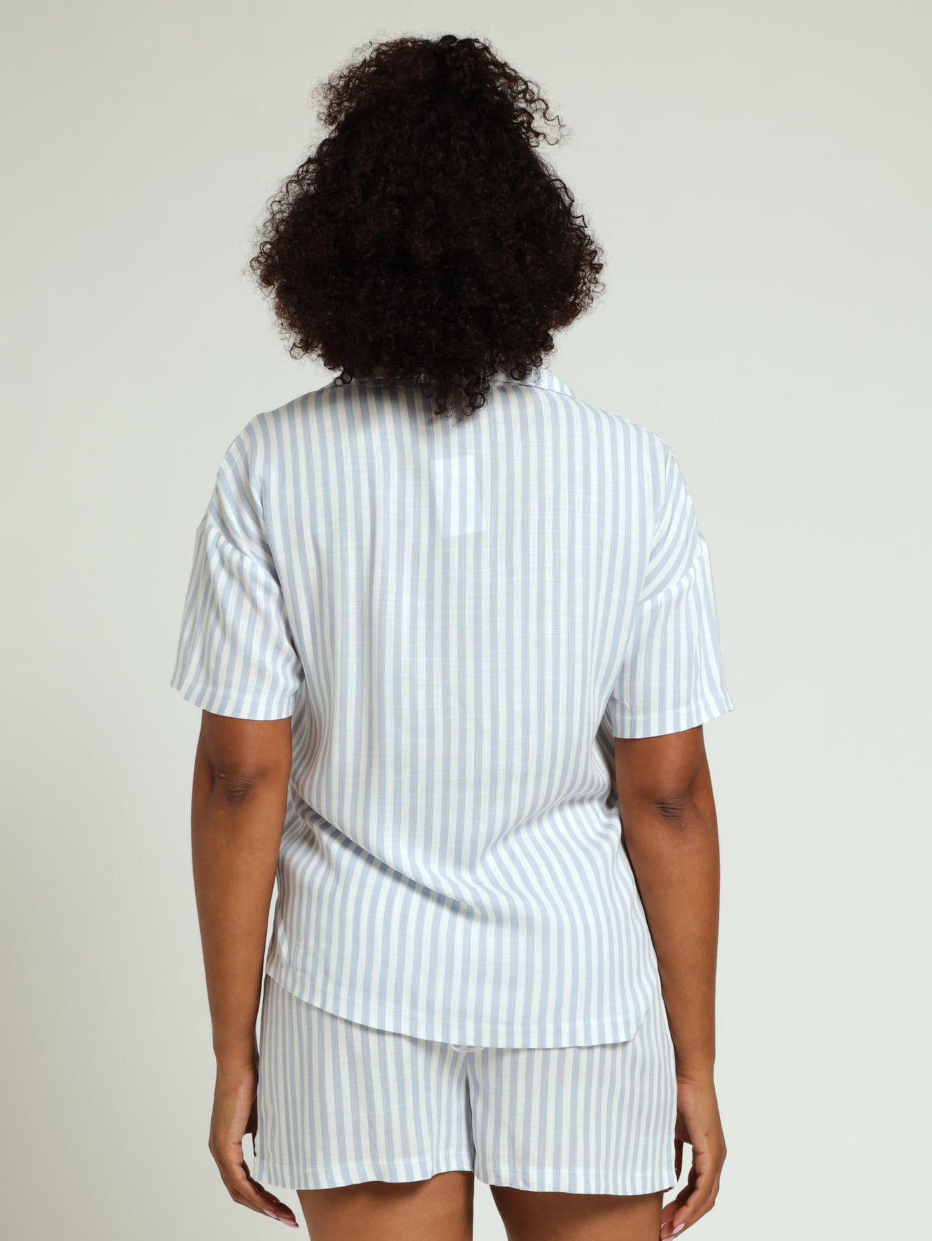 Linen Stripe Button Through Pj Shorts Set - White/Blue