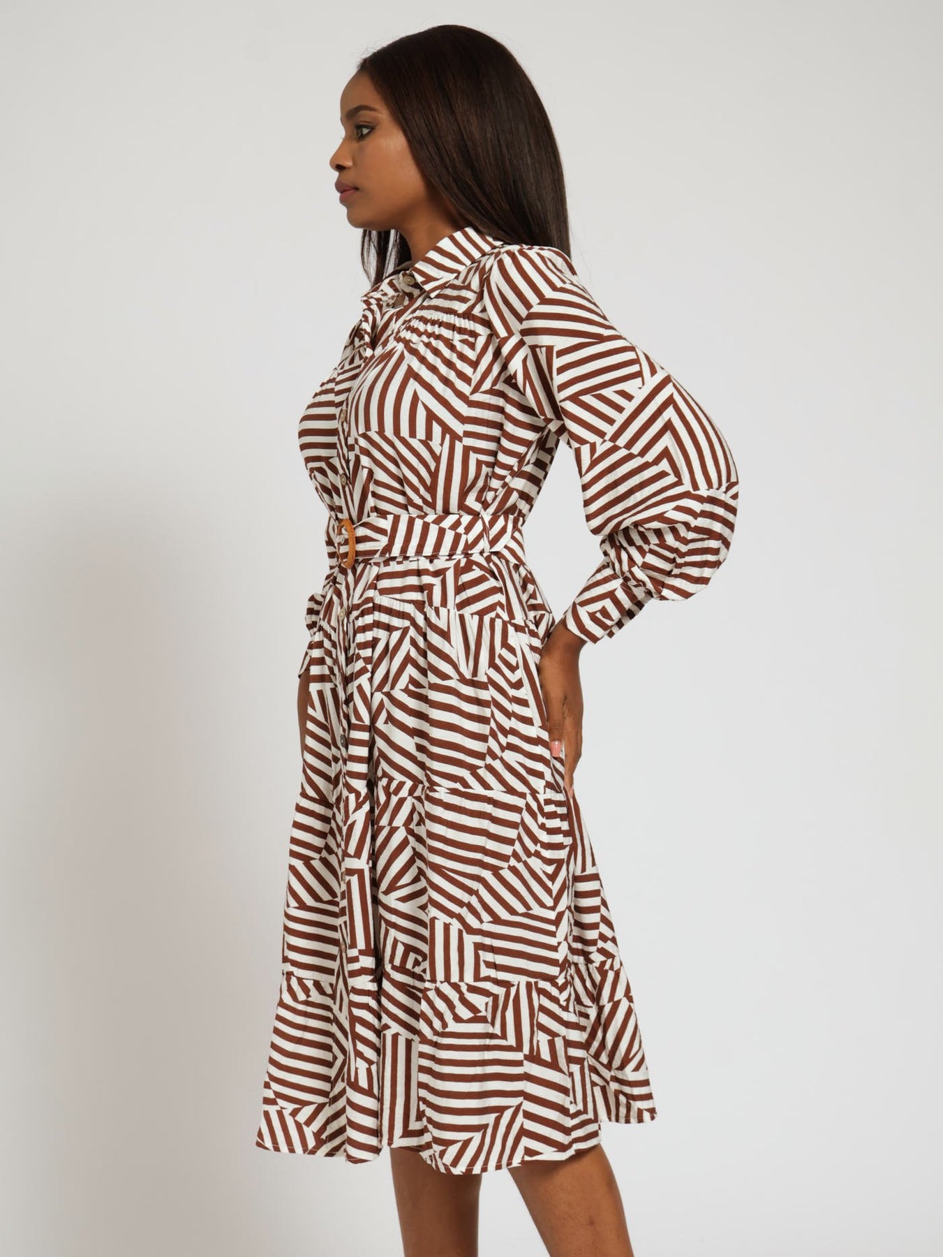 Long Sleeve Belted Tiered Maxi Shirt Dress - Brown/White