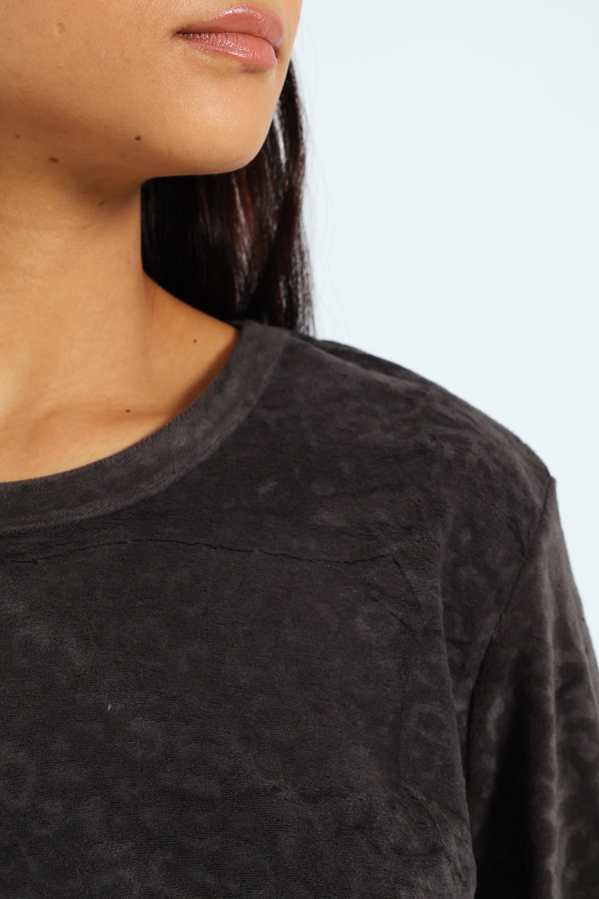 Long Sleeve Embossed Animal Print Top & Pants Set - Charcoal