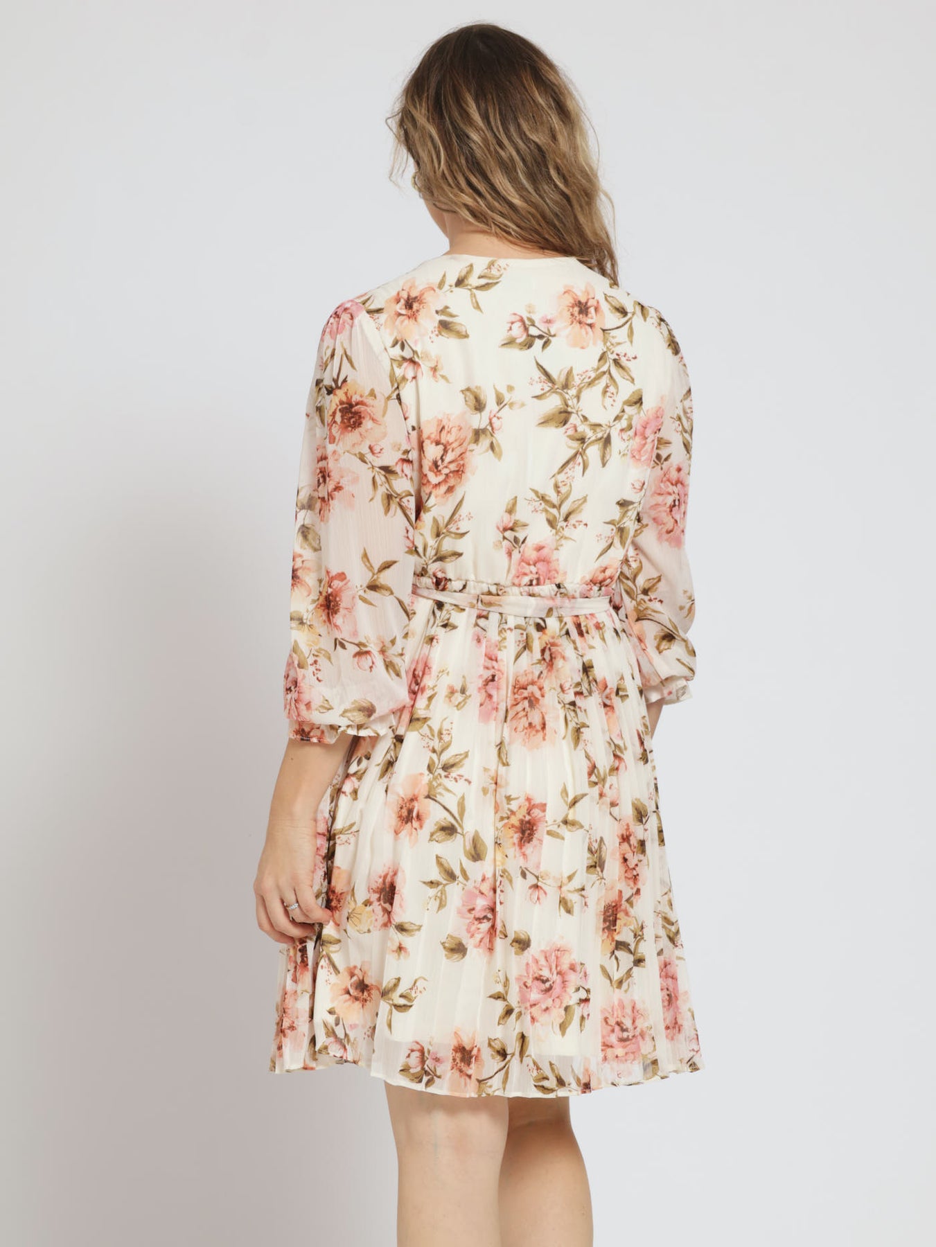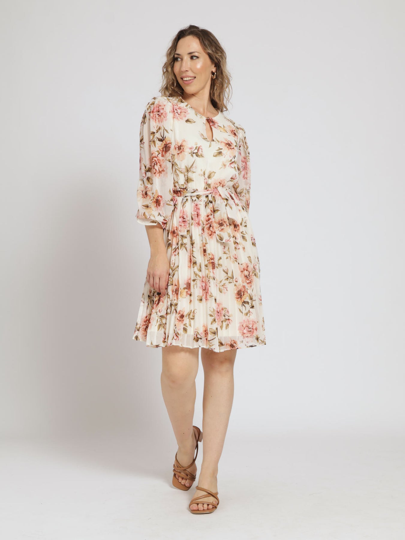 Make an entrance in our Long Sleeve Front Key Hole Pleated Tea Dress! With its stunning floral design and good quality, this dress is sure to turn heads. Embrace the feeling of being effortlessly chic and confident. Available in cream. Don't miss out on this must-have dress!
