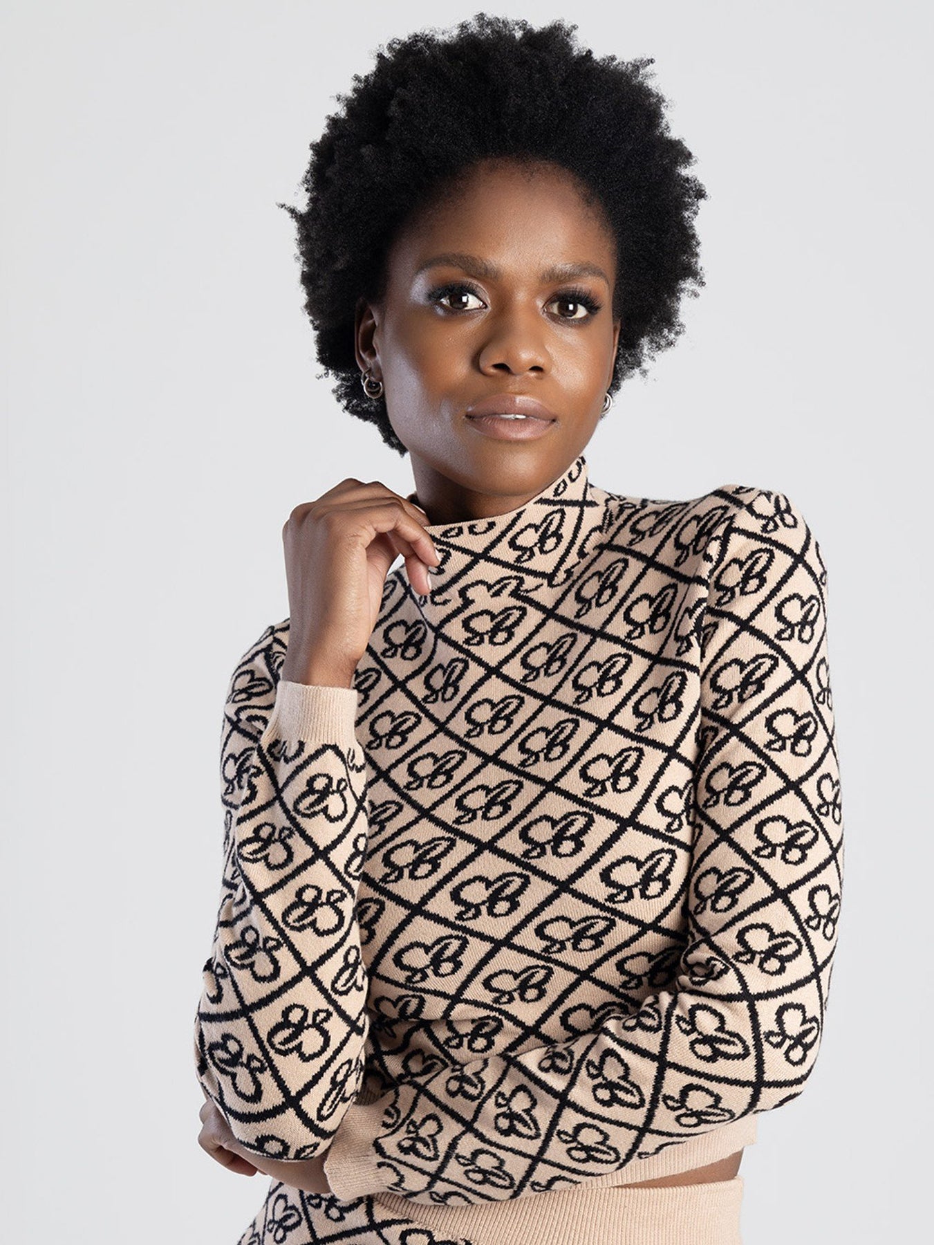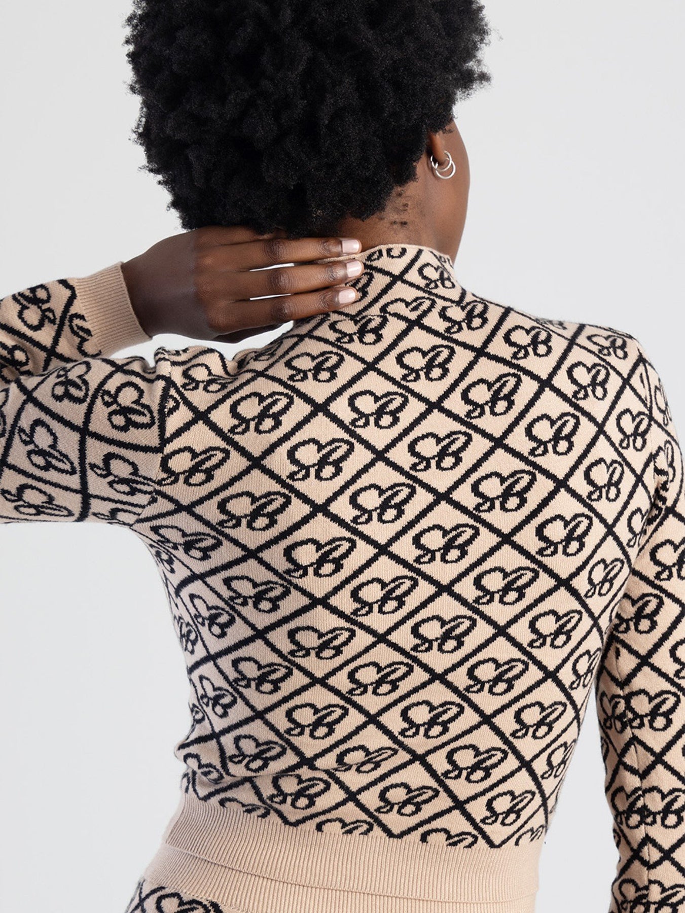 Long Sleeve Knit Turtle-Neck Logo Crop Top - Stone