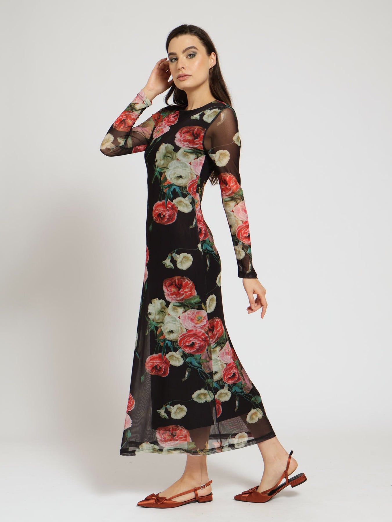 Long Sleeve Pleated Mesh Aline Maxi Dress
