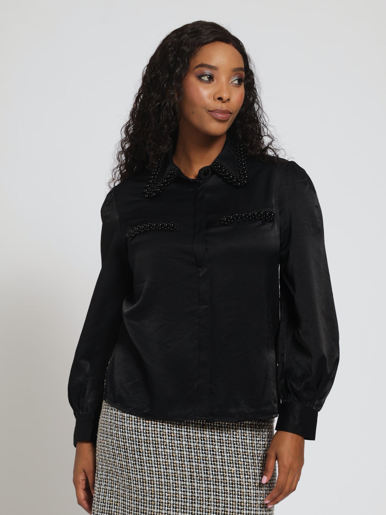Long Sleeve Satin Pearl Detail Shirt - Black