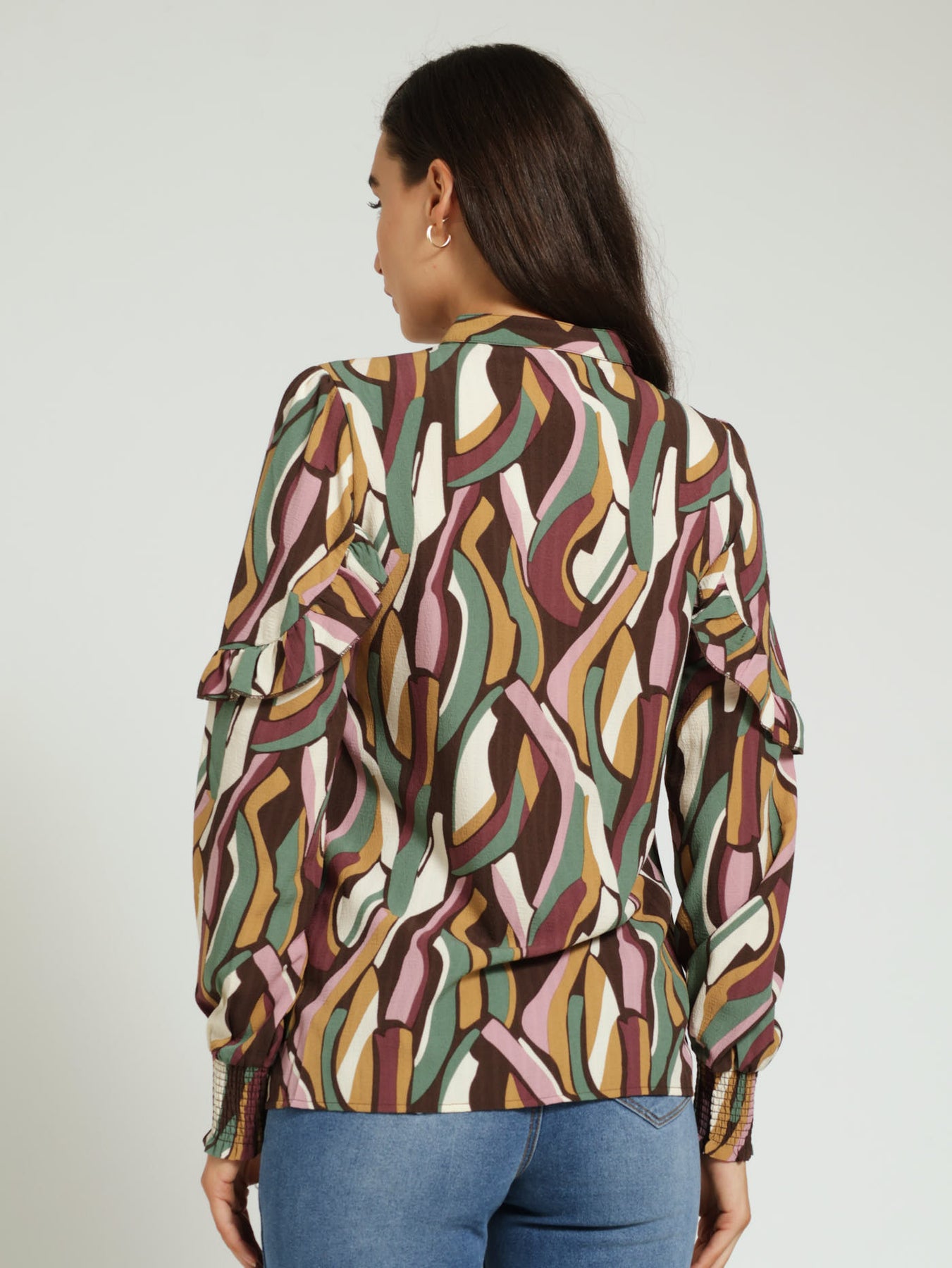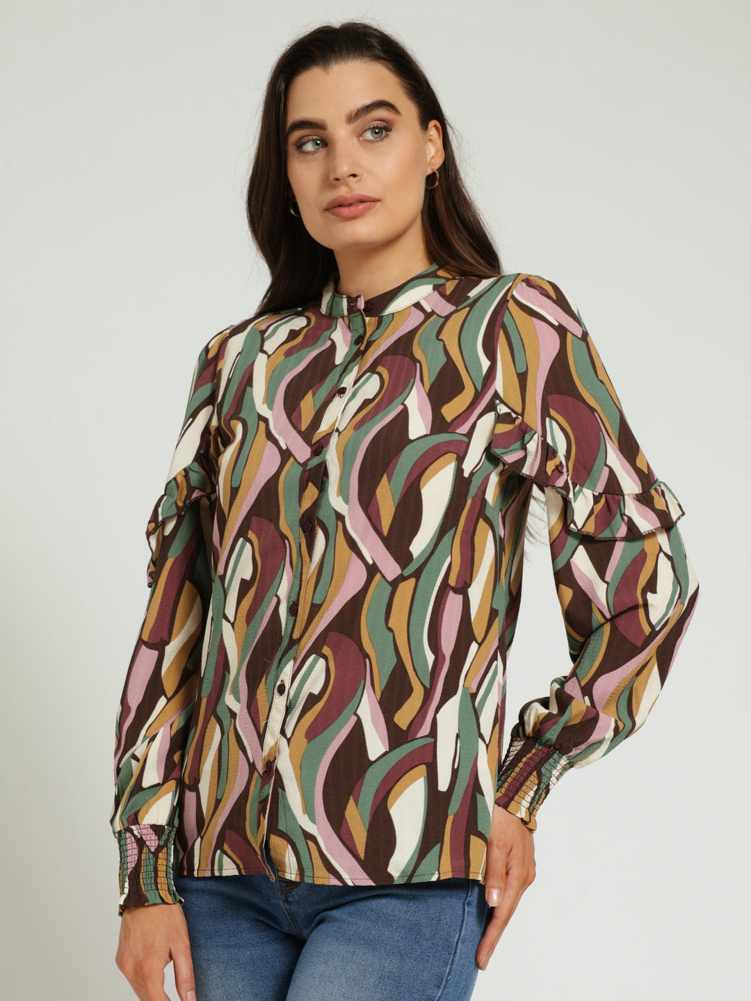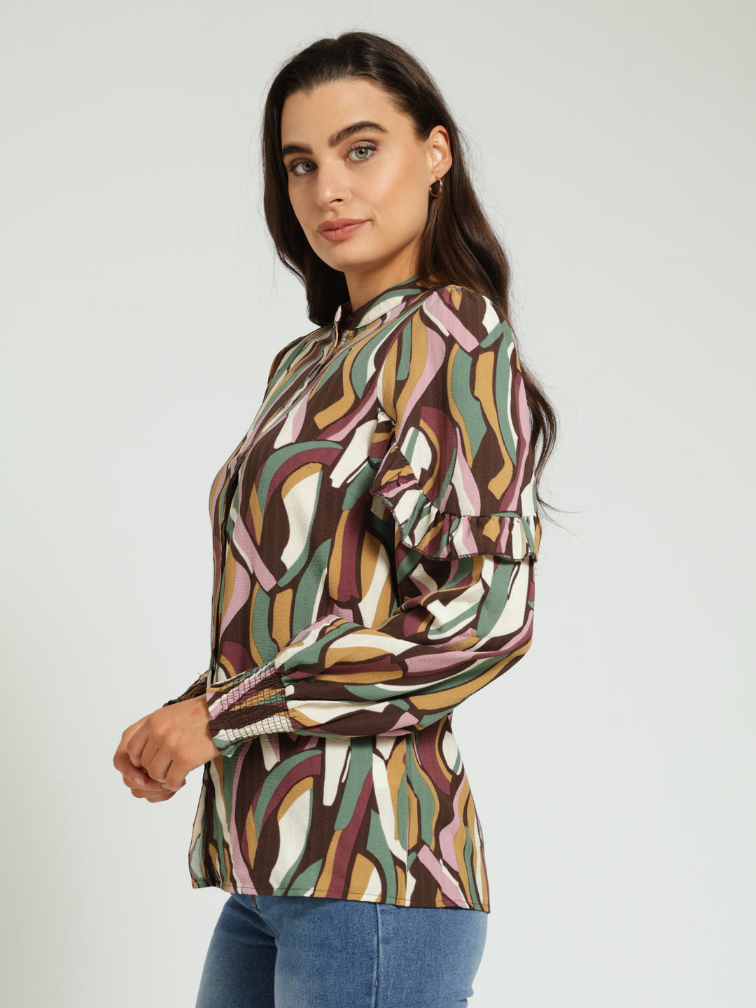 Long Sleeve Shirred Cuff Frill Detail Shirt