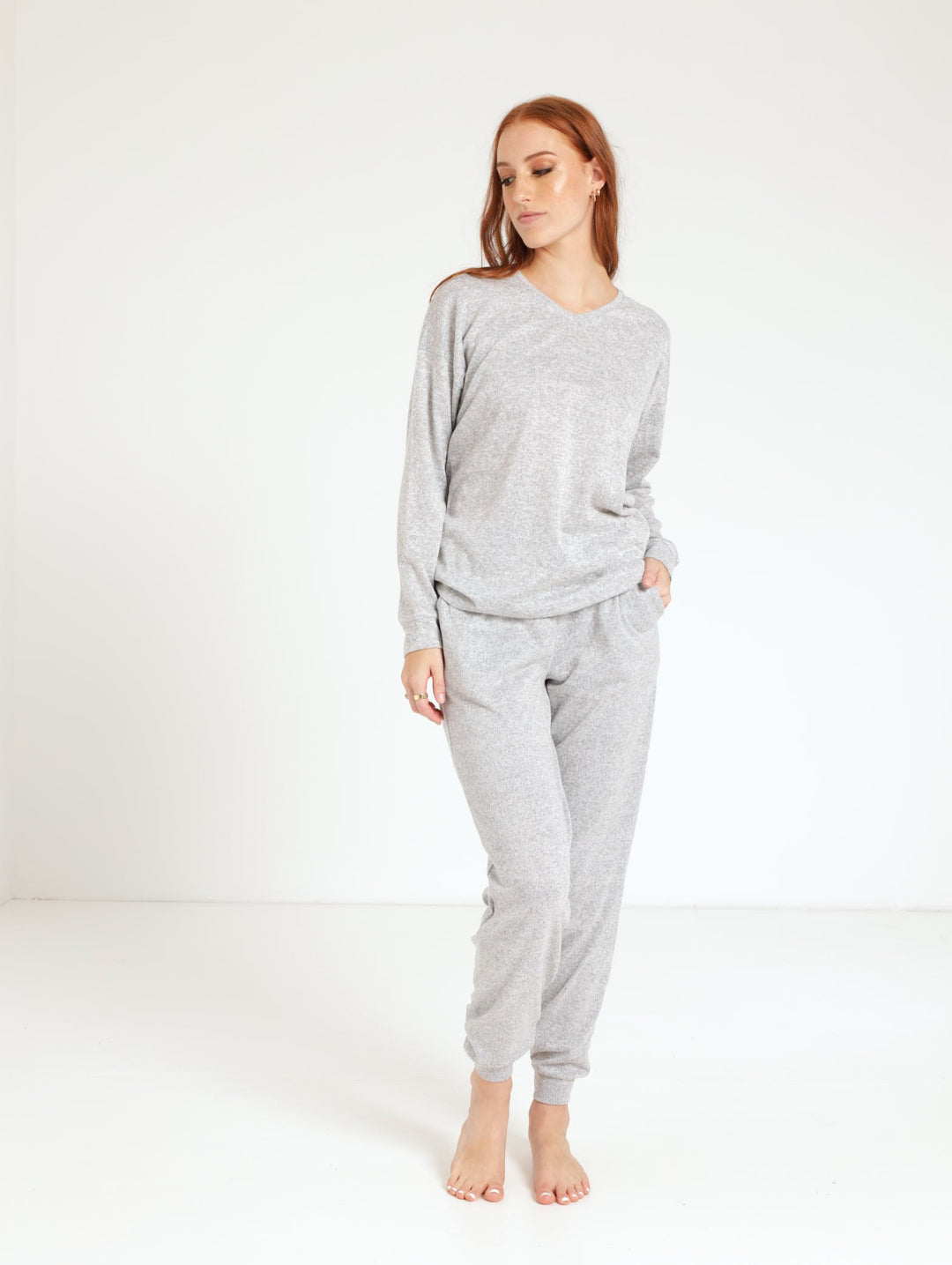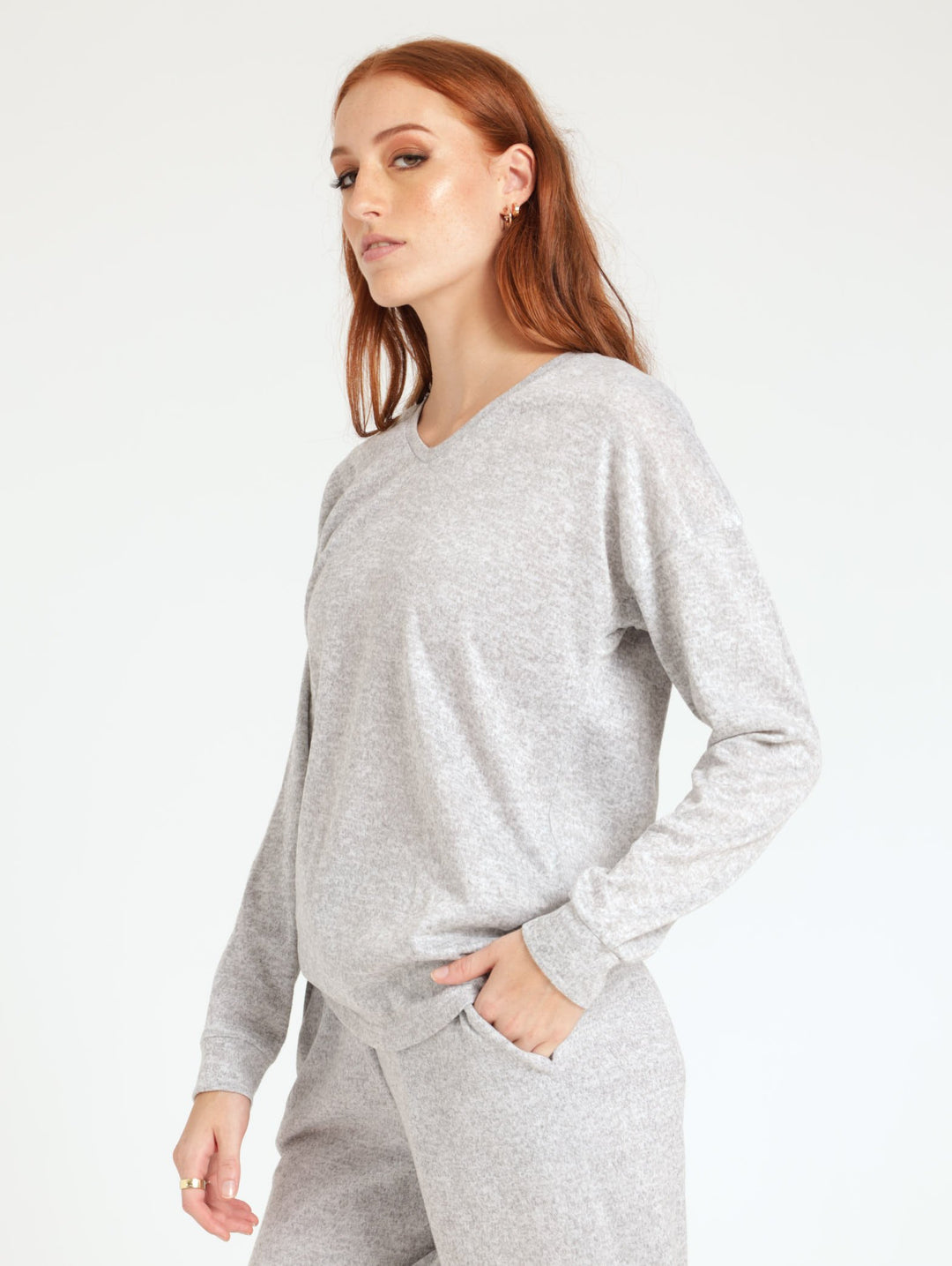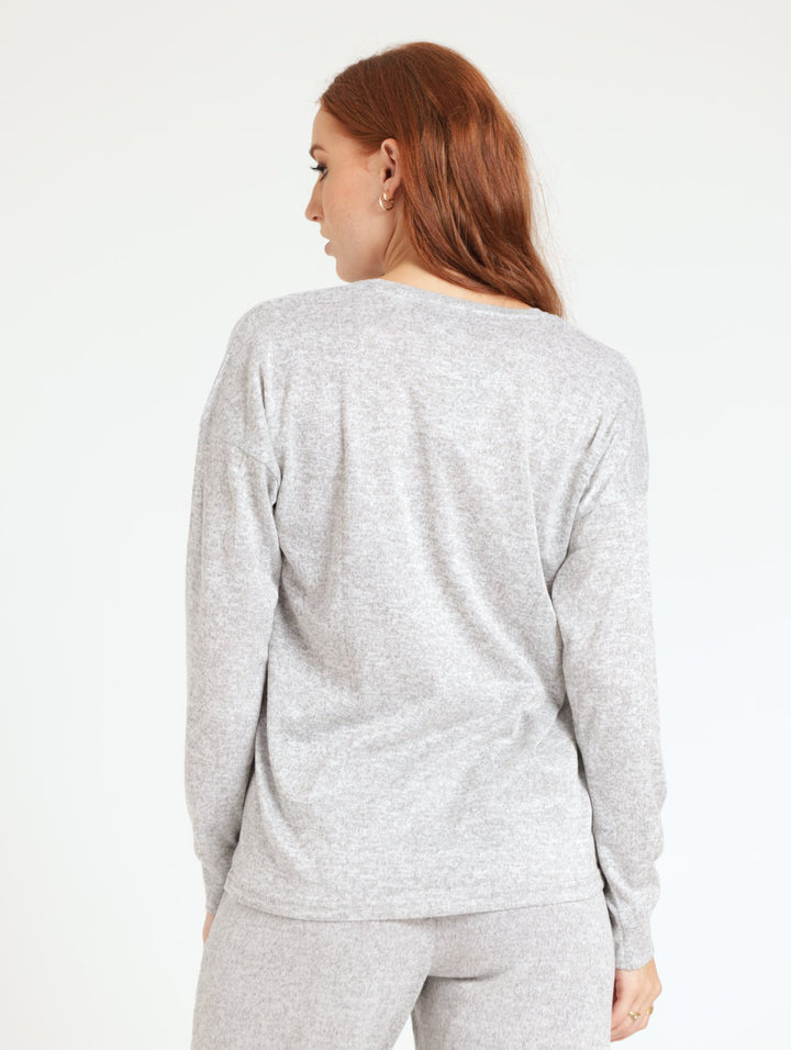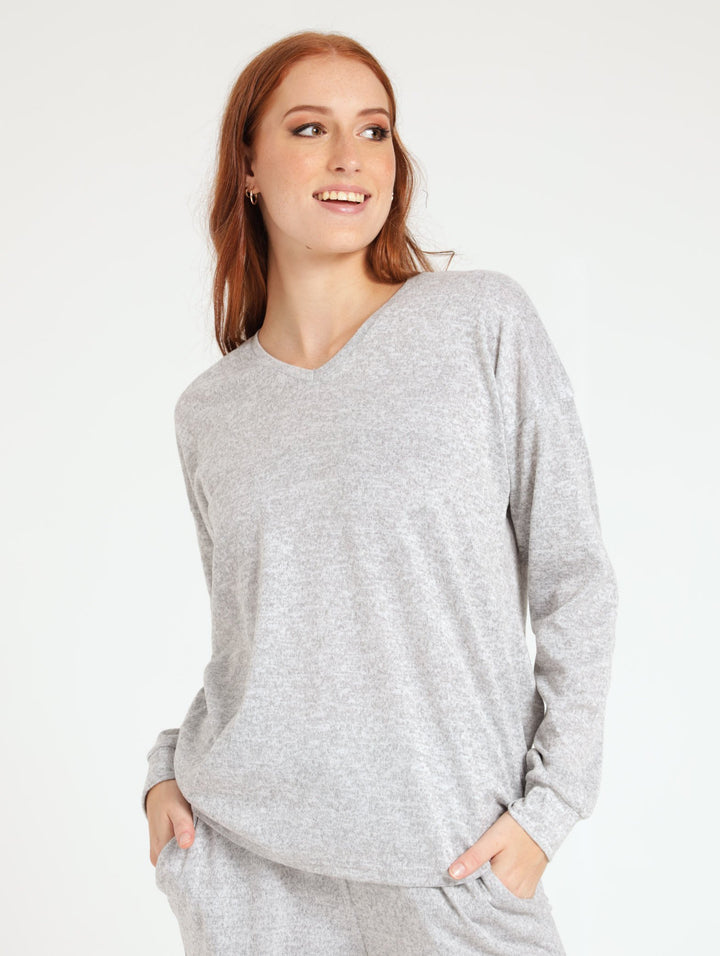 Long Sleeve Textured V-Neck Top - Grey Melange