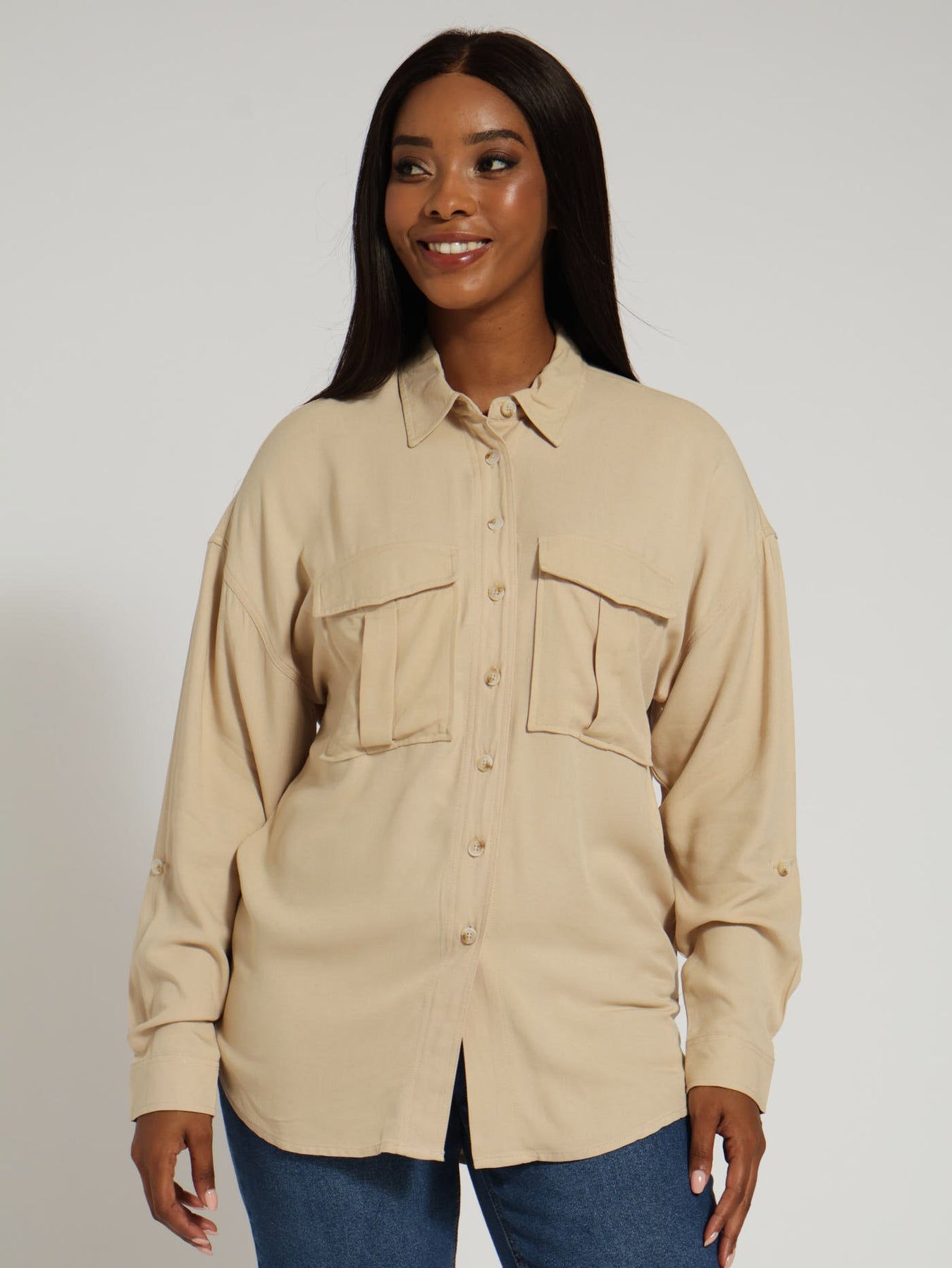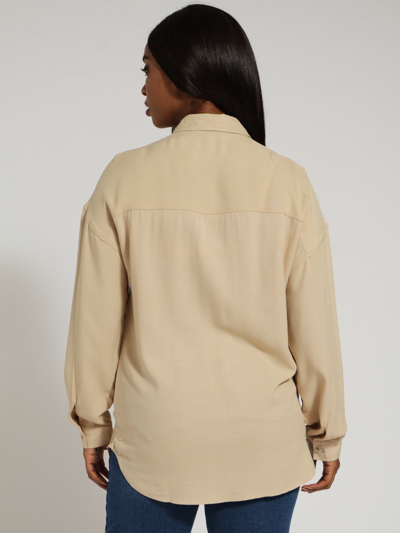 Long Sleeve Utility Shirt With Pocket Flaps - Stone