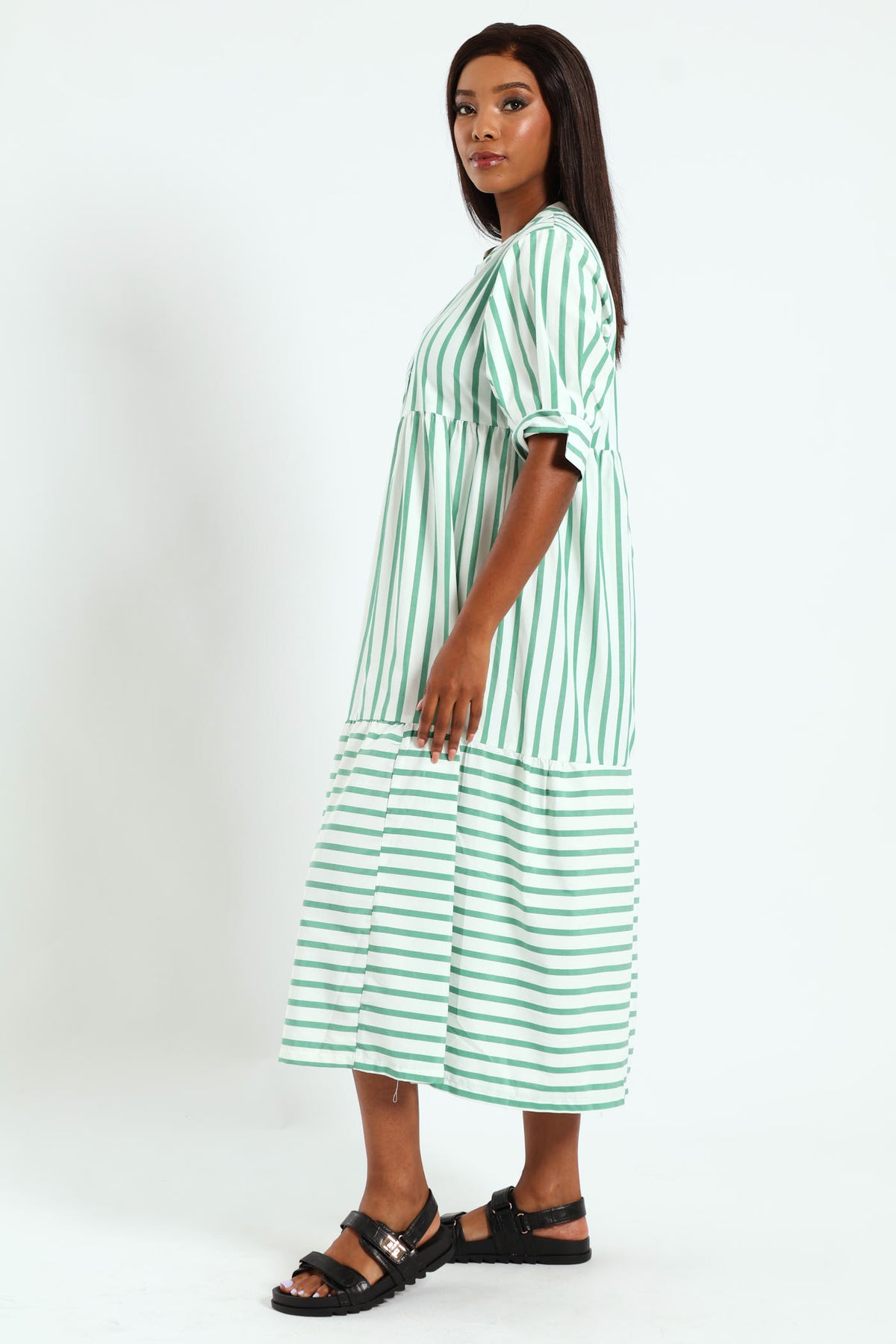 Mandarin Collar Tiered Midaxi Dress - White/Cabbage