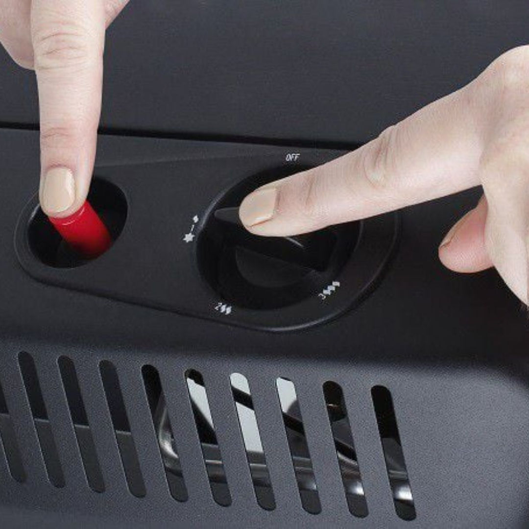 3. While still pressing down the gas control knob, press and depress the ignition button until the pilot light (at the bottom of the burner) ignites. Continue to hold the gas control knob down for 10-15 seconds or until the ceramic plate lights up. Upon releasing the gas control knob, if the pilot flame goes out, repeat the above operation.
