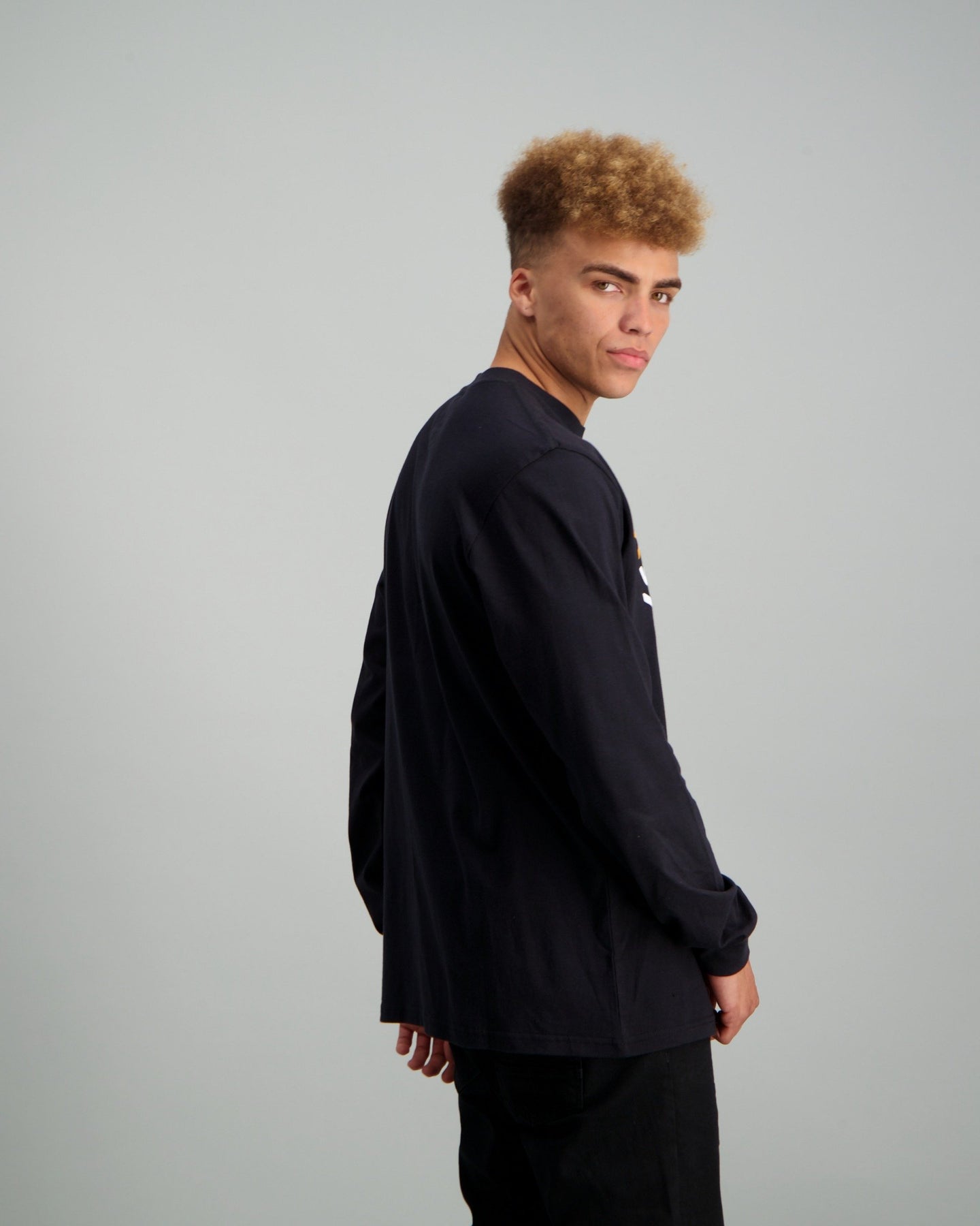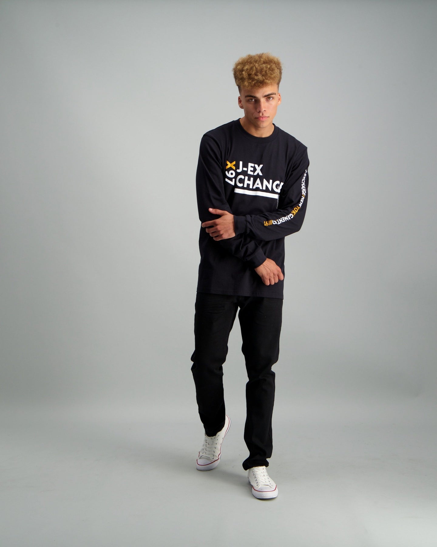 Upgrade your basic winter collection with this statement long sleeve top. Featuring a front and sleeve side tape print and cuffed sleeves. Pair with joggers and slip on shoes for a casual at-home look.