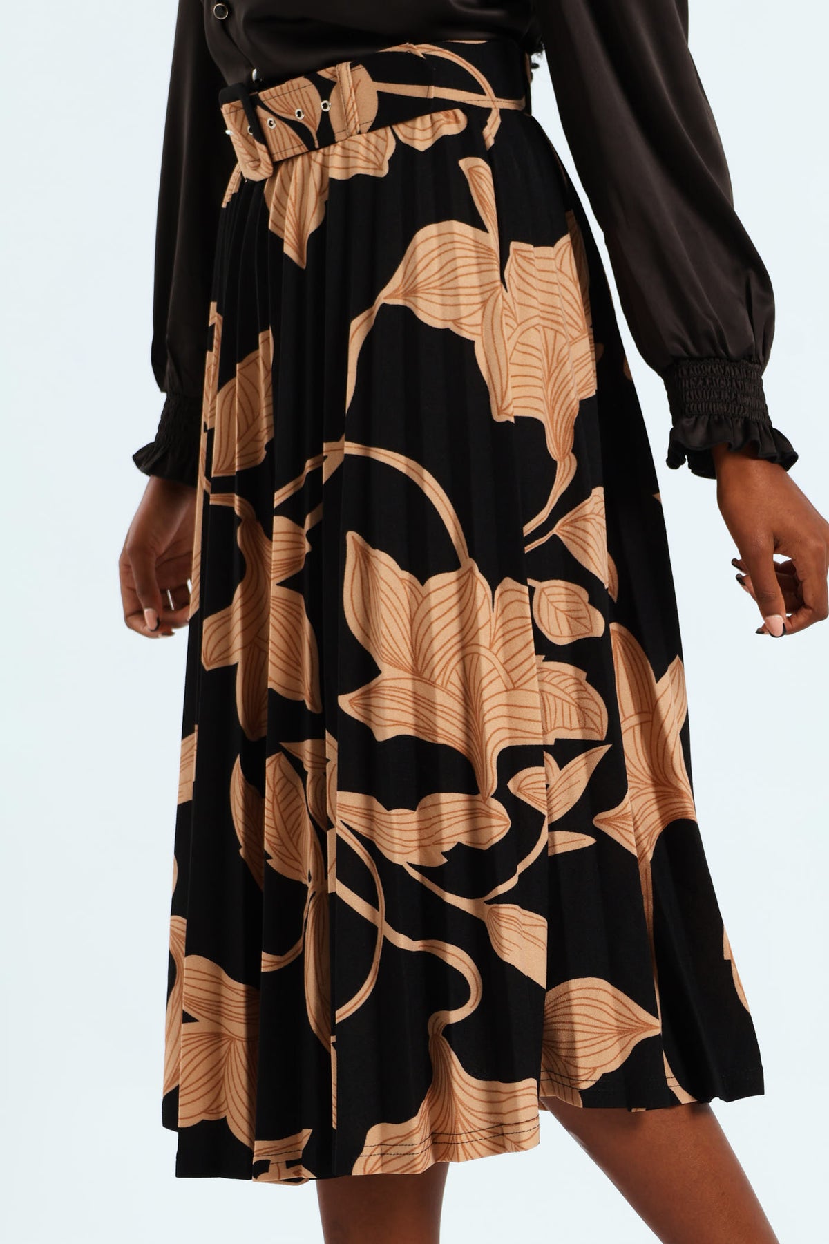 Monochrome Pleated Midi Skirt - Black/Tan