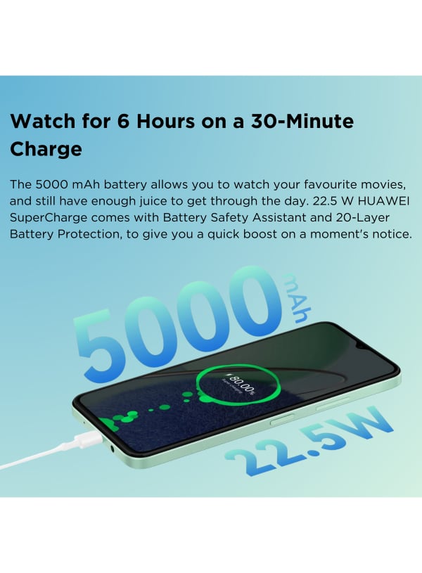 The 5000 mAh battery allows you to watch your favourite movies, and still have enough juice to get you through the day. 22.5 W HUAWEI SuperCharge comes with Battery Safety Assistant and 20-Layer Battery Protection, to give you a quick boost at a moment's notice.
