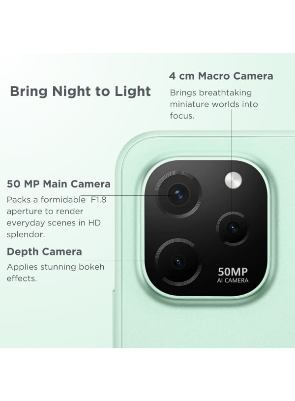 • Camera: Rear - 50MP, 2MP Macro Camera (F2.4 aperture), Depth Camera - 2MP (F2.4 aperture), Front - 5MP (F2.2 aperture)