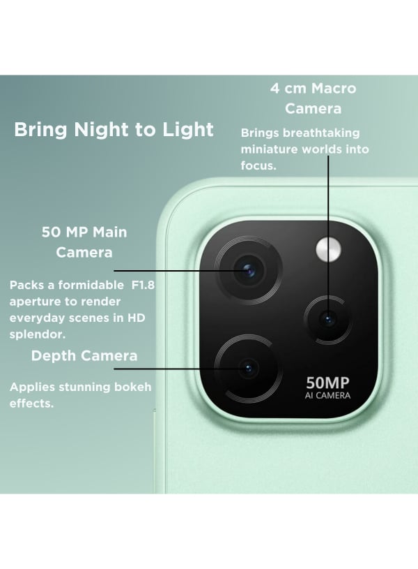 • Camera: Rear - 50MP, 2MP Macro Camera (F2.4 aperture), Depth Camera - 2MP (F2.4 aperture), Front - 5MP (F2.2 aperture)