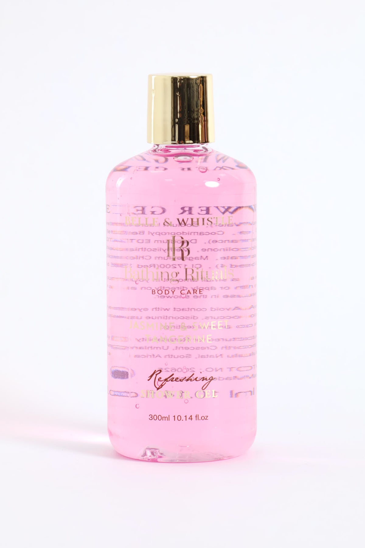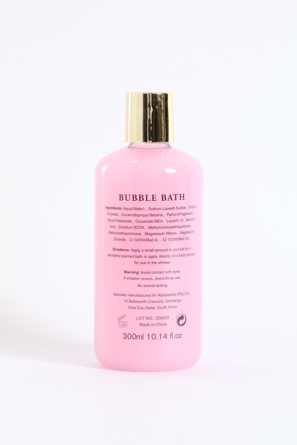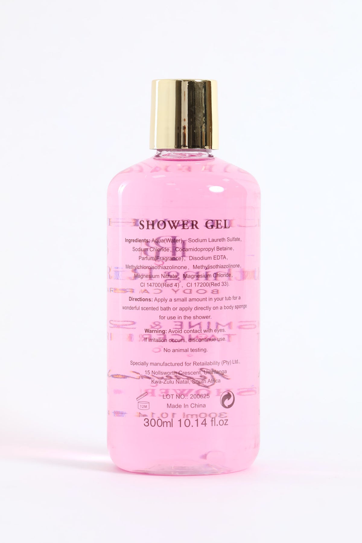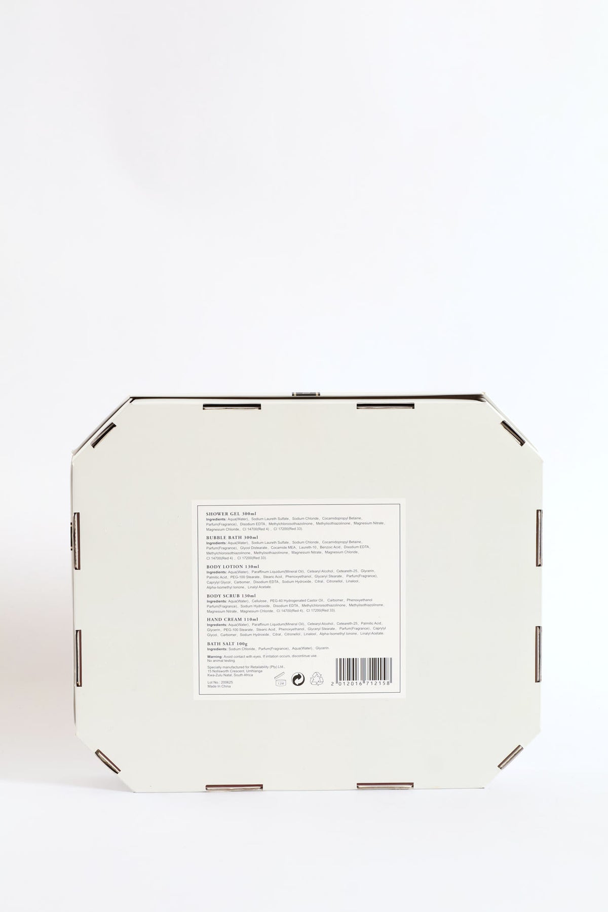 300ml shower gel 300ml bubble bath130ml tube body lotion 130ml tube body scrub 110ml jar hand cream100g bath salt