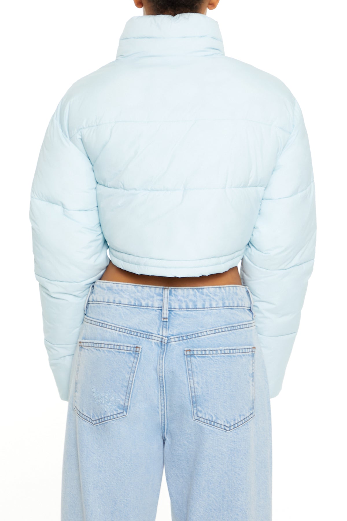 A woven puffer jacket featuring a zip-up closure, funnel neck, long sleeves, and a cropped hem.