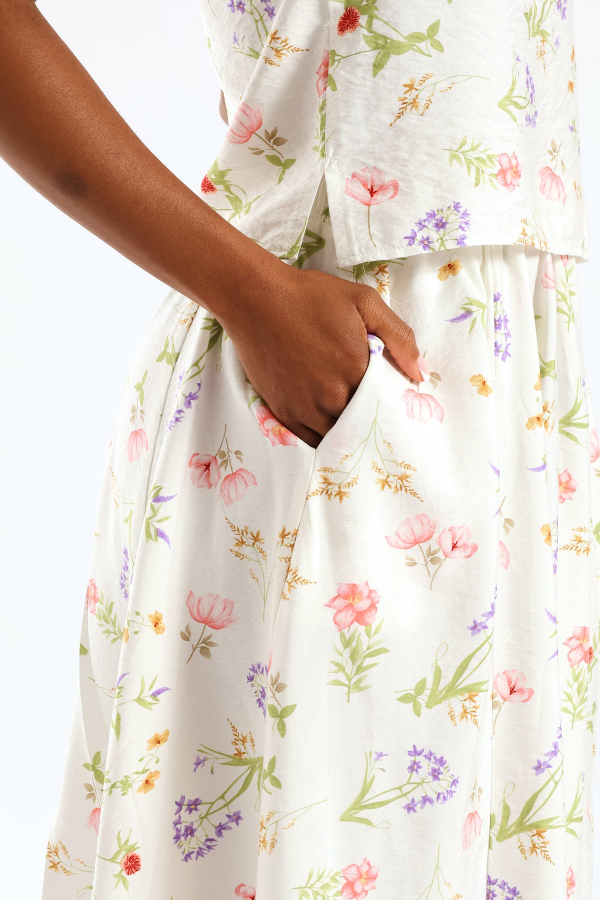 Pull On Elasticated Flare Garden Floral Print Midi Skirt - Cream