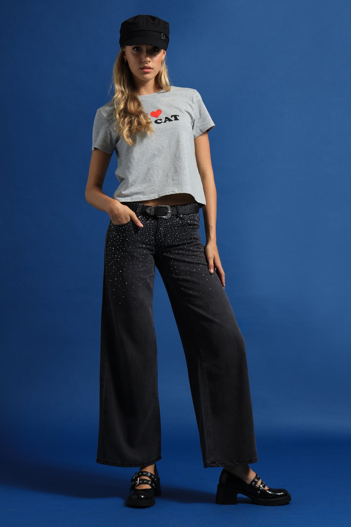 Crafted from non-stretch denim, this pair of baggy jeans features rhinestone front embellishments, a low-rise waist, belt loops, zip fly and button-front closure, wide leg, and five-pocket construction.