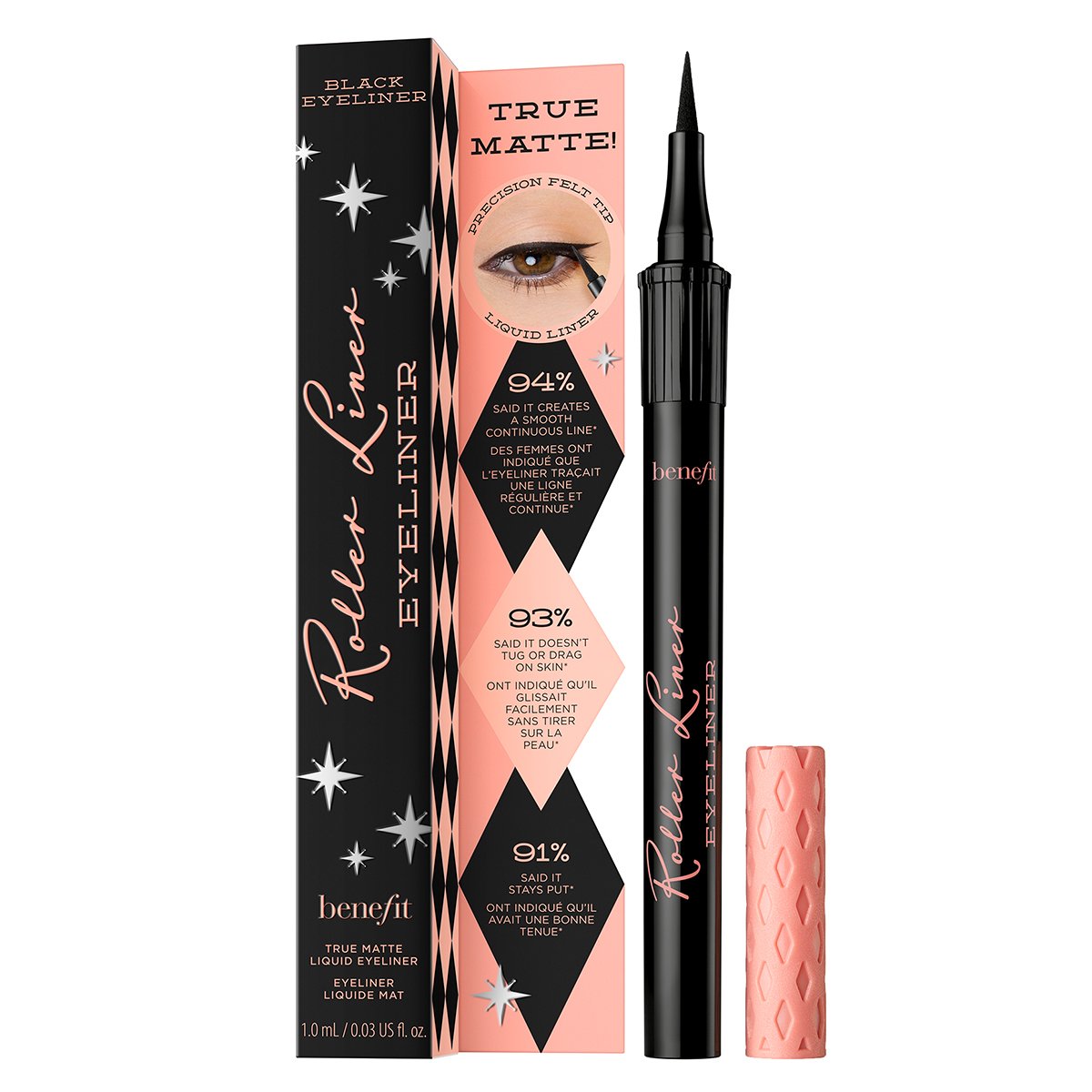 Glide on a natural-looking, fine line with Roller Liner! Our matte liquid eyeliner features a precision felt tip for sharp controlled lines and a super-smooth application that won’t drag or jag. The quick-dry, waterproof* formula lasts 24-hours**. It doesn’t fade, flake or smudge so you can let the good times roll all day & night!