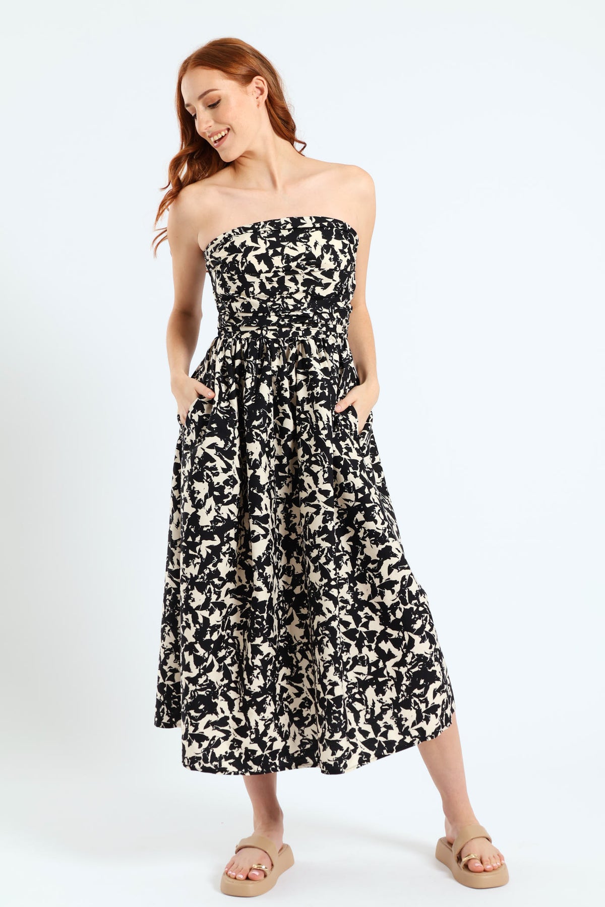 This stunning midi dress features a flattering ruched bodice and fit & flare silhouette, designed to accentuate your figure. The versatile black and beige print adds a touch of elegance, while the detachable straps offer customizable styling options. Elevate your wardrobe with this must-have dress!