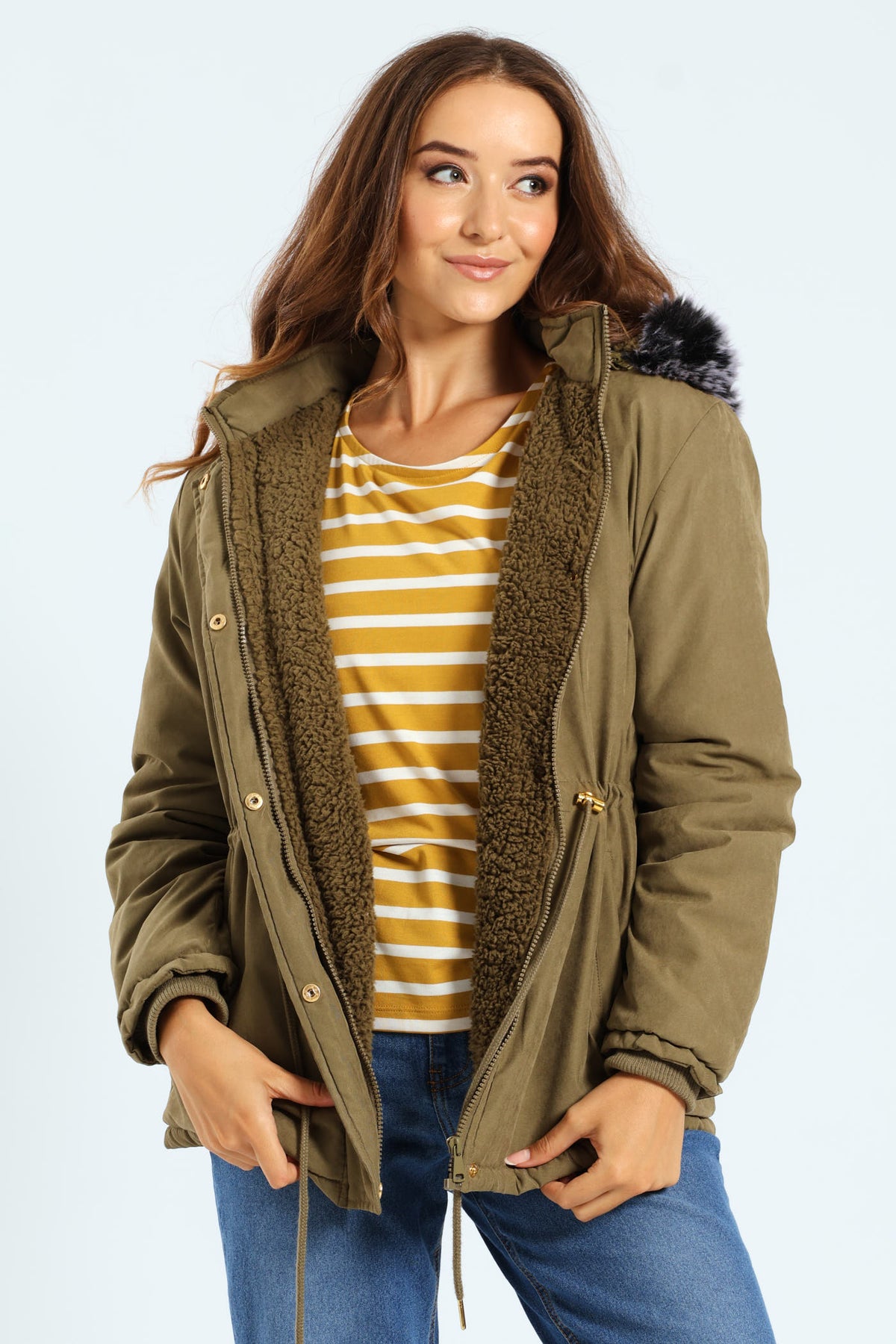 Sherpa Lined Parker With Contrast Detachable Fur Hood - Army Green