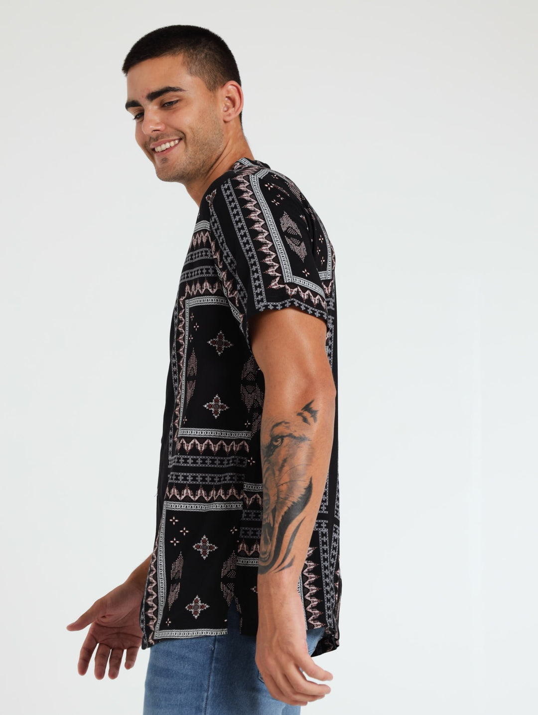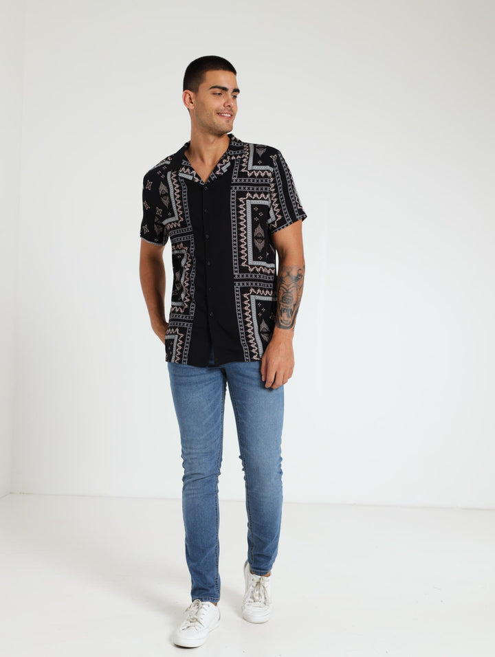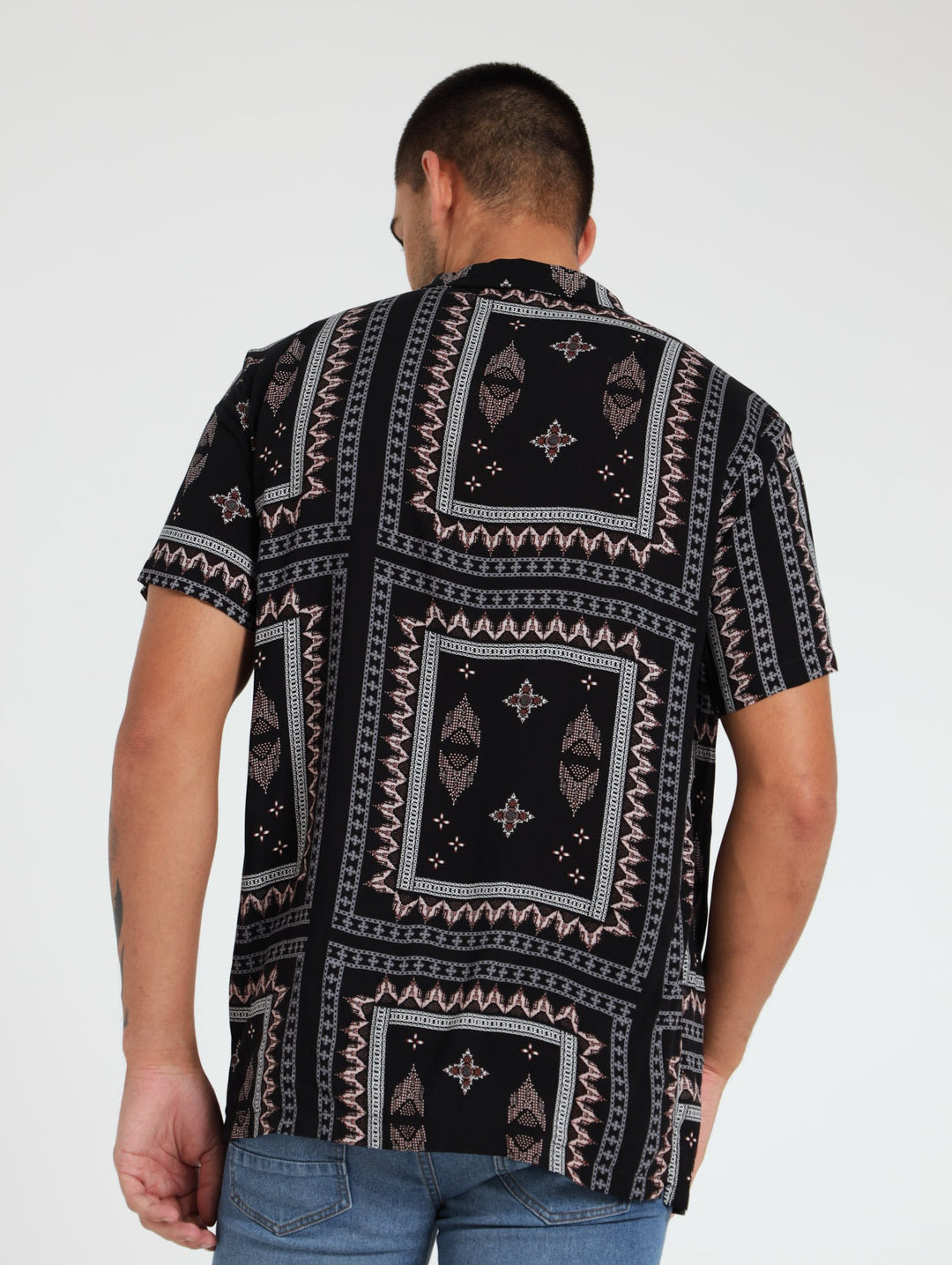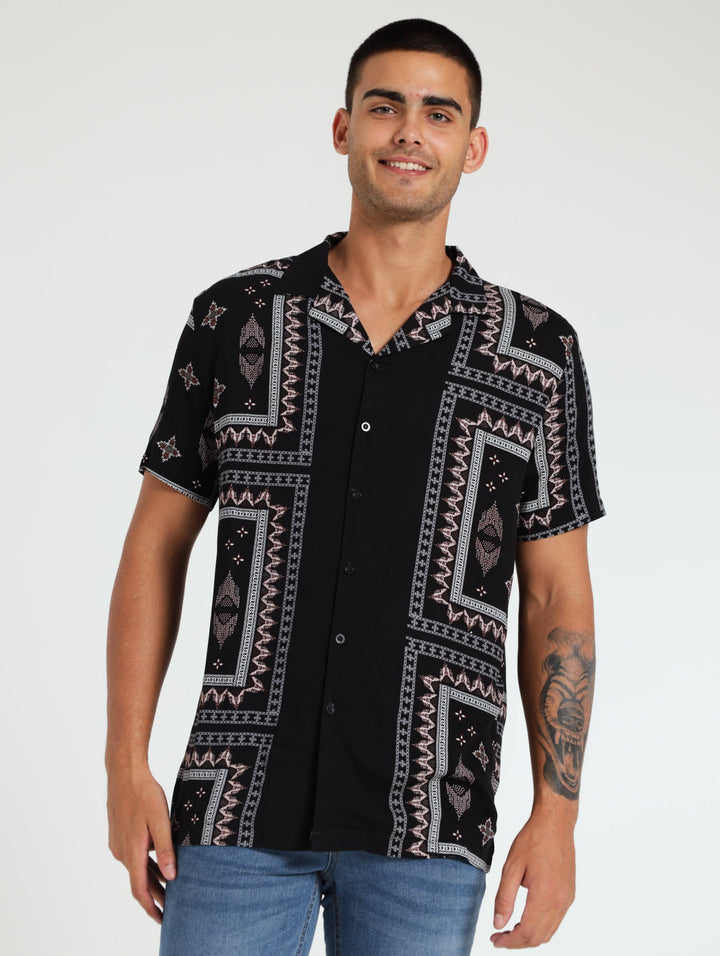 Short Sleeve Viscose Rotary Print Shirt - Black