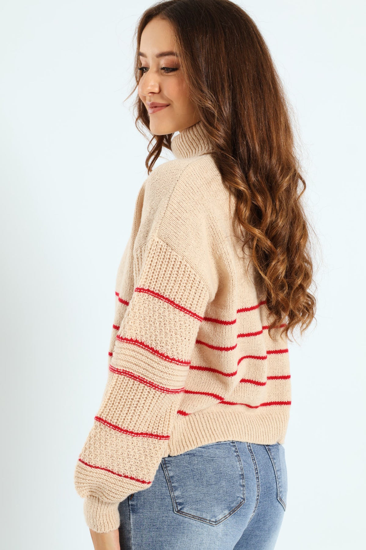 Sleeve Detail Stripe Poloneck - Stone/Red