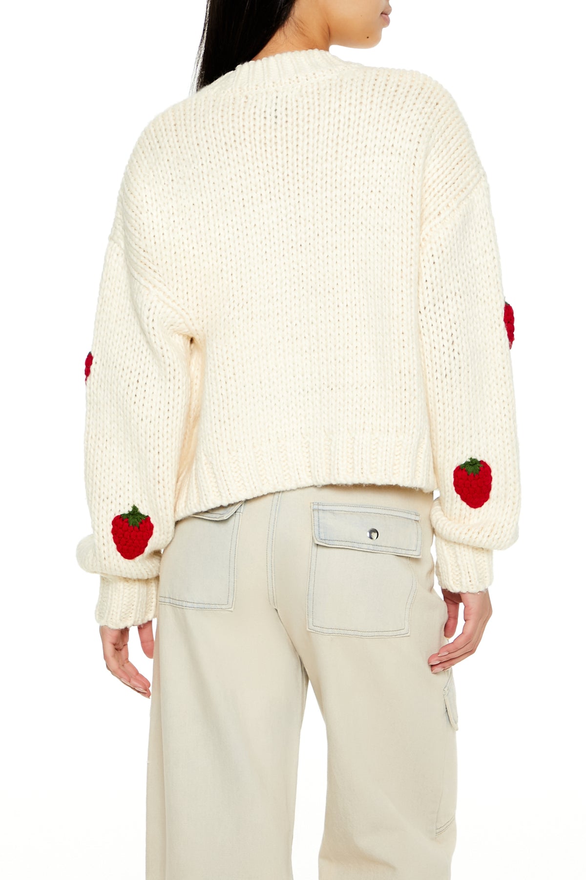 A knit cardigan sweater featuring front strawberry pattern, dropped long sleeves, ribbed trim, and open front.