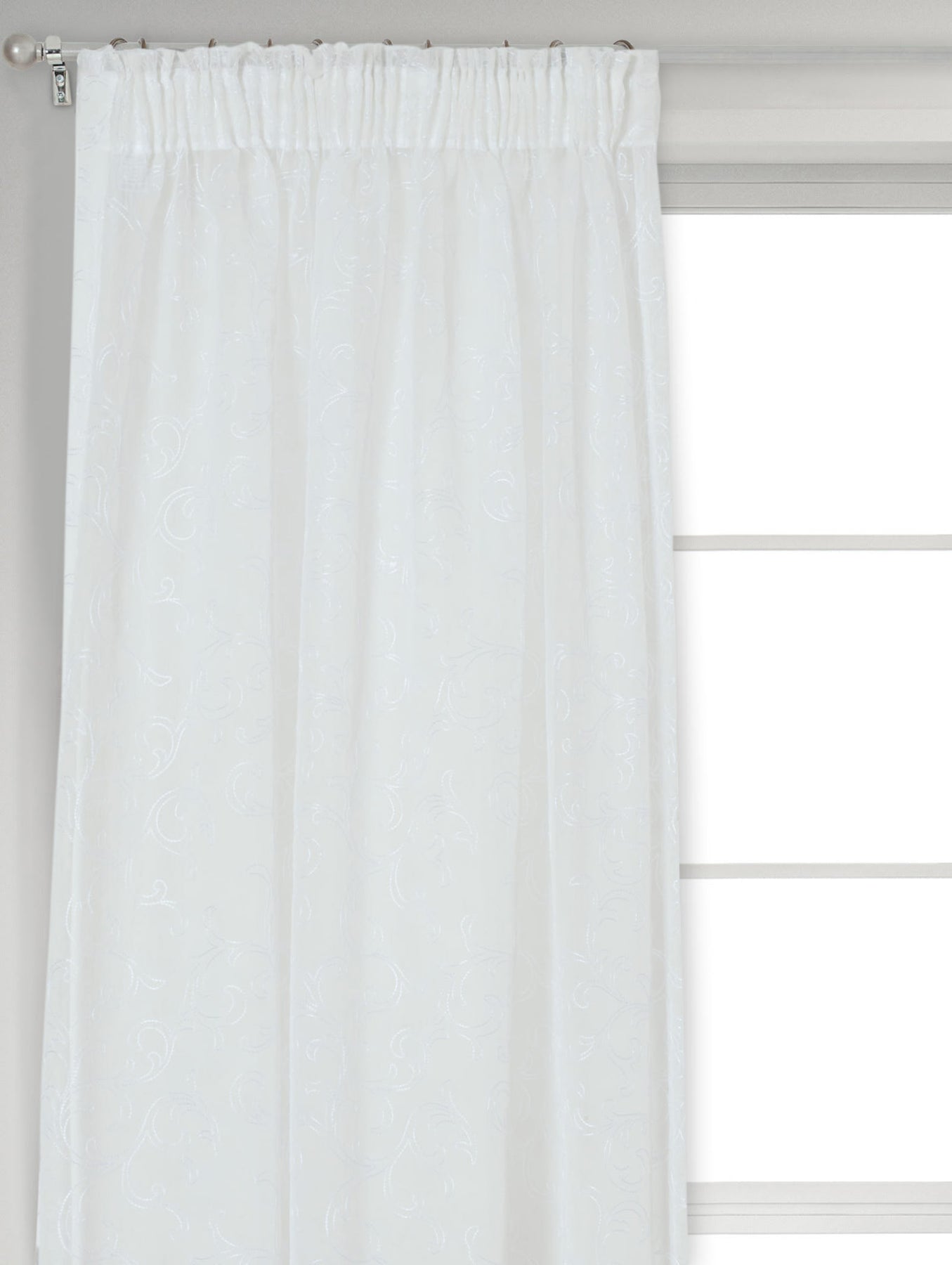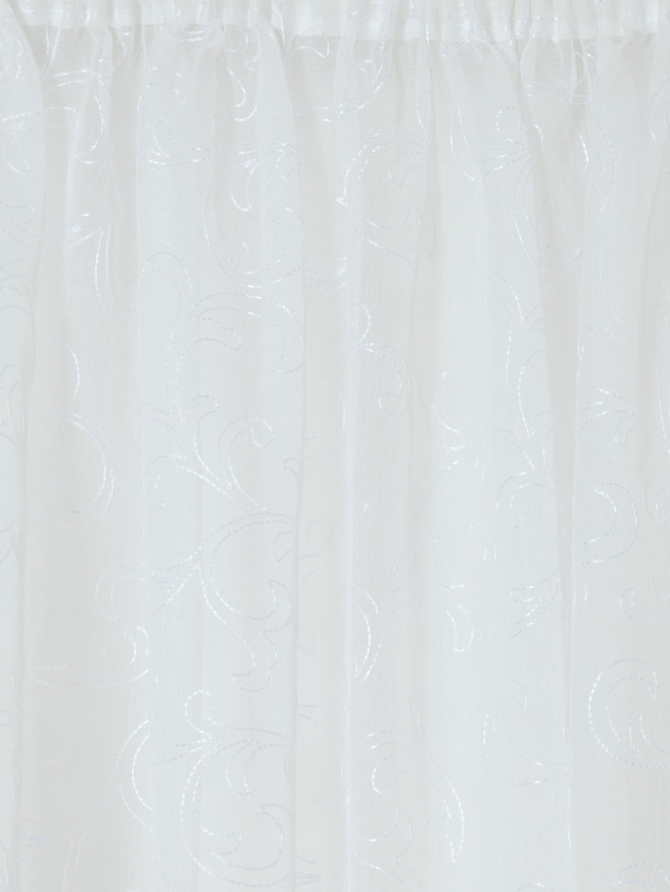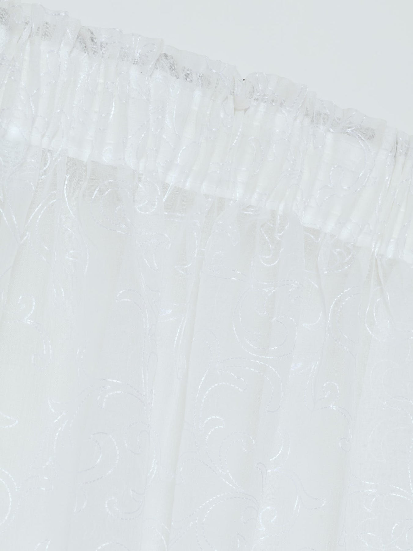Introduce elegance and sophistication to your space with our Tape Standard Sheer Scroll Curtain in white. The delicate scroll design and sheer fabric add a touch of subtle charm to any room. Featuring a versatile tape standard for easy installation, it is a timeless addition to any decor.