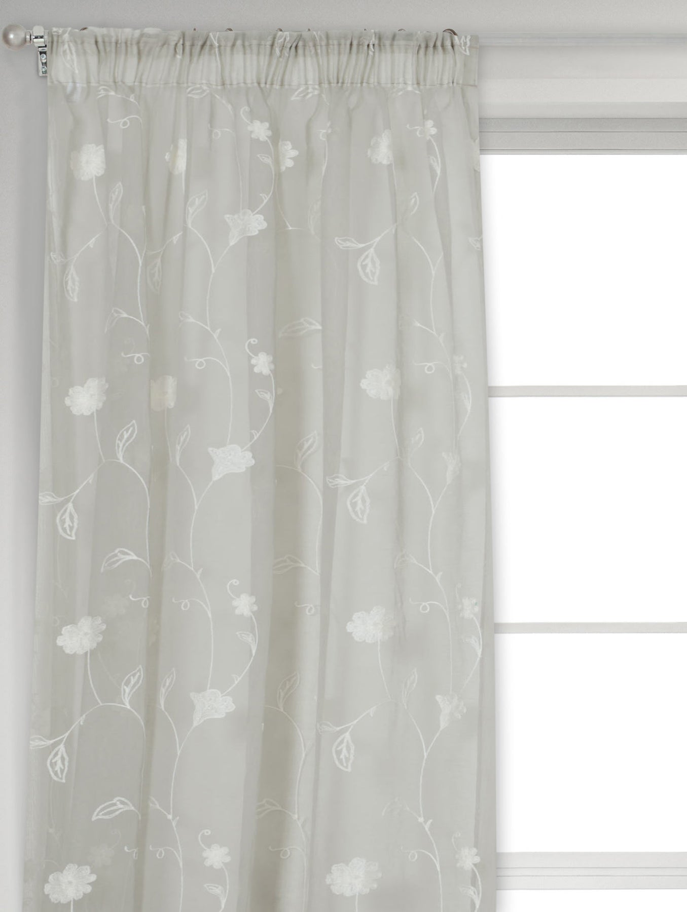 Enhance your home decor with our Taped Standard Length Sheer Blooming Curtain in Grey. Made with lightweight material, it adds a touch of elegance to any room. Its taped top offers easy installation and maintenance, while the sheer fabric allows for natural light to filter through, creating a warm and inviting atmosphere.