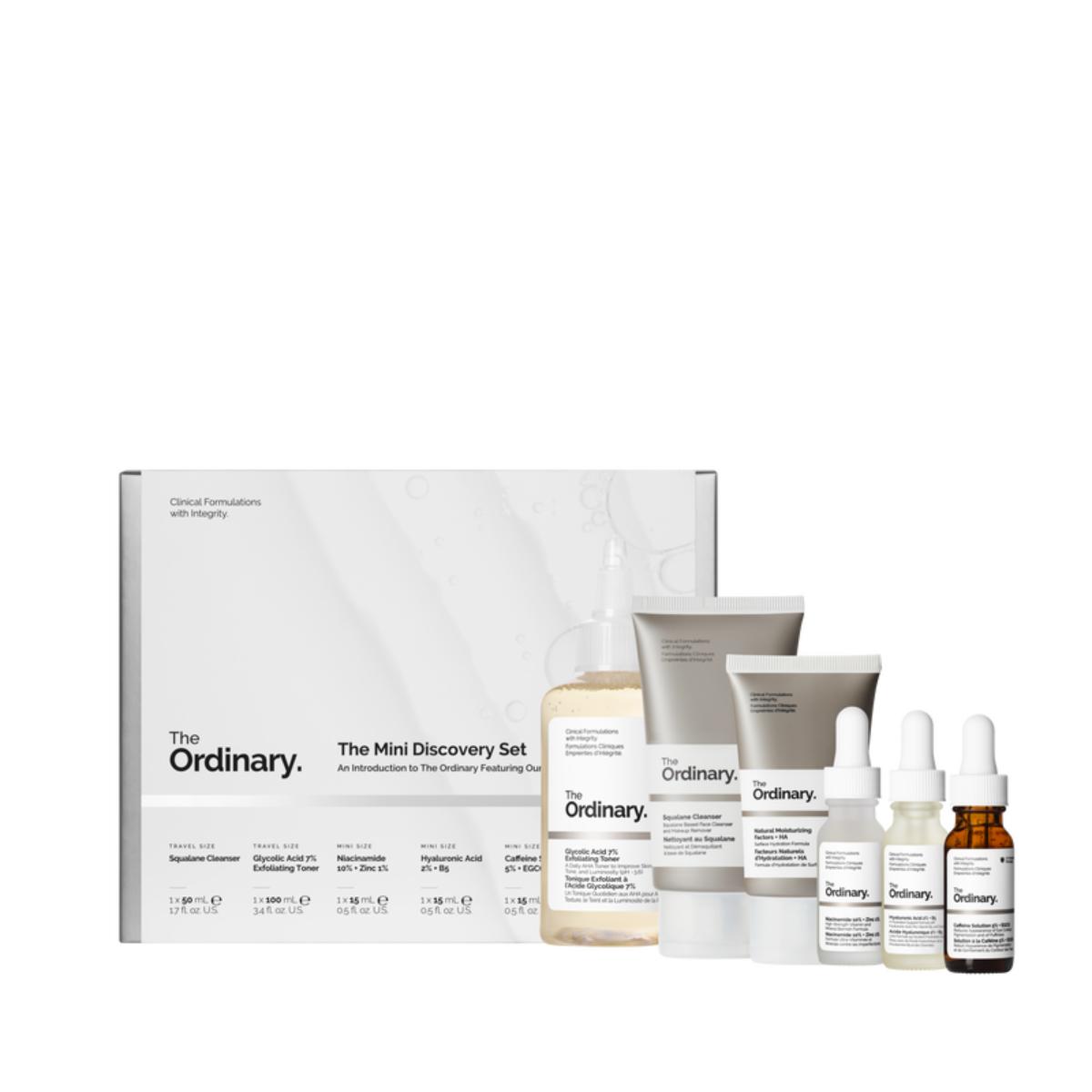 The Mini Discovery Set is the ideal place to begin with The Ordinary. It features miniature sizes of some of our most popular formulations for a complete skincare regimen. The set includes a cleanser, exfoliating toner, face serums, an eye serum and a moisturizer, which can be used together in a daily regimen.