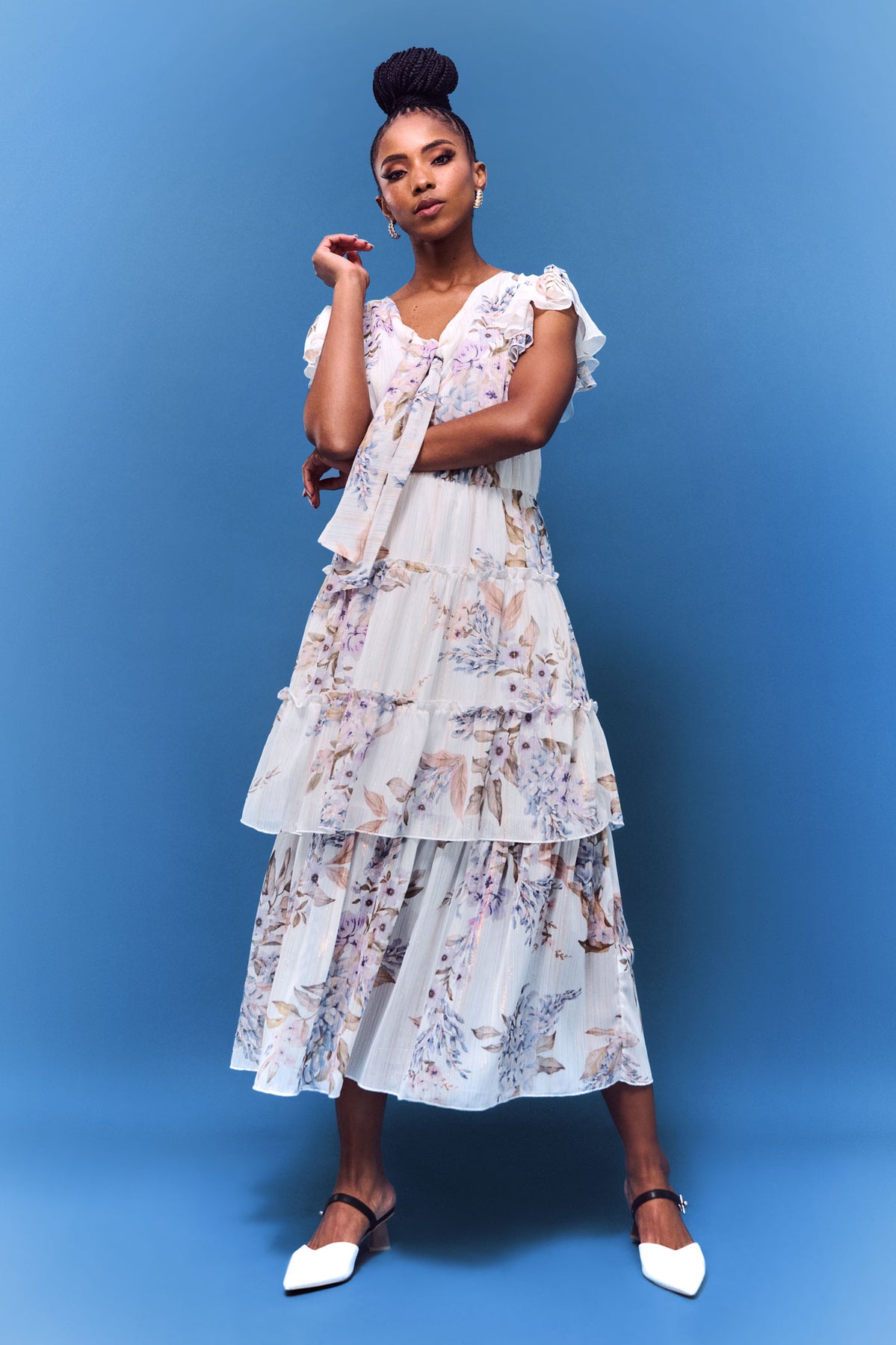 This white and blue maxi dress is the ultimate in sophisticated style. The tie front and flutter sleeves add a pretty touch to this elegant and versatile dress. Perfect for any occasion, this dress will make you feel confident, beautiful, and stylish.