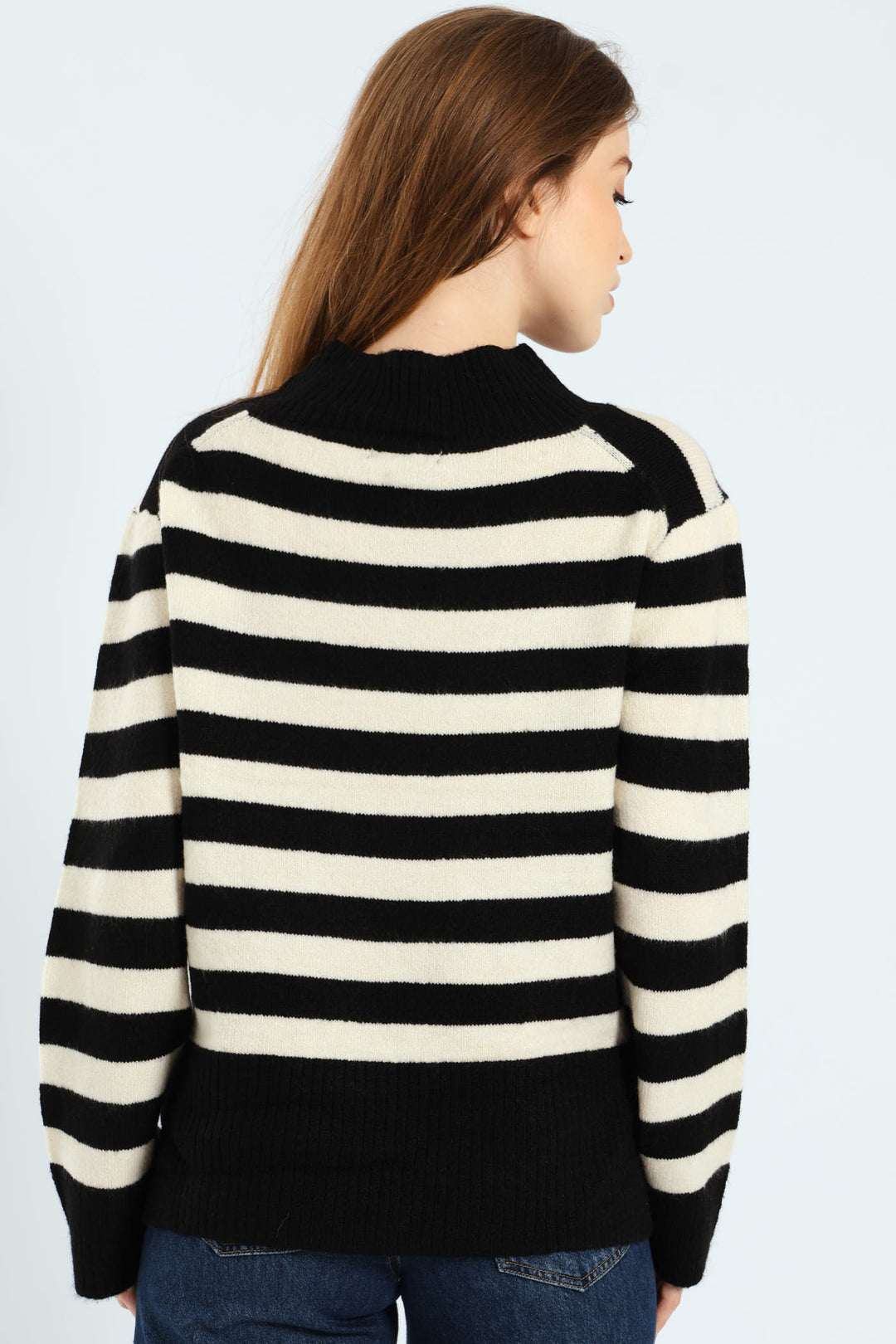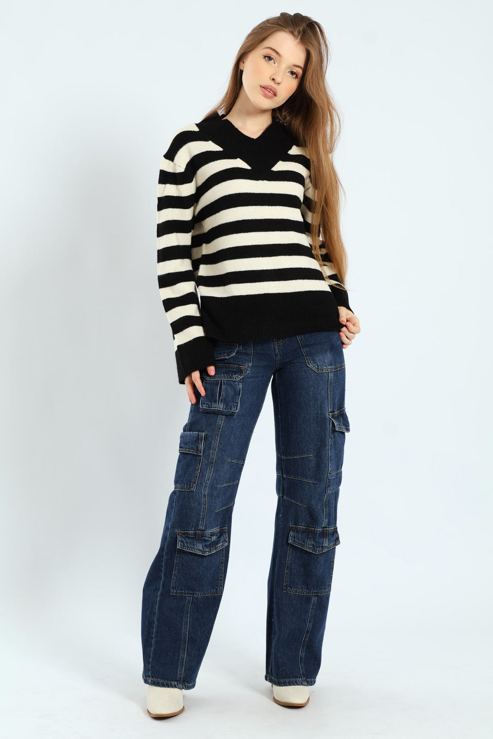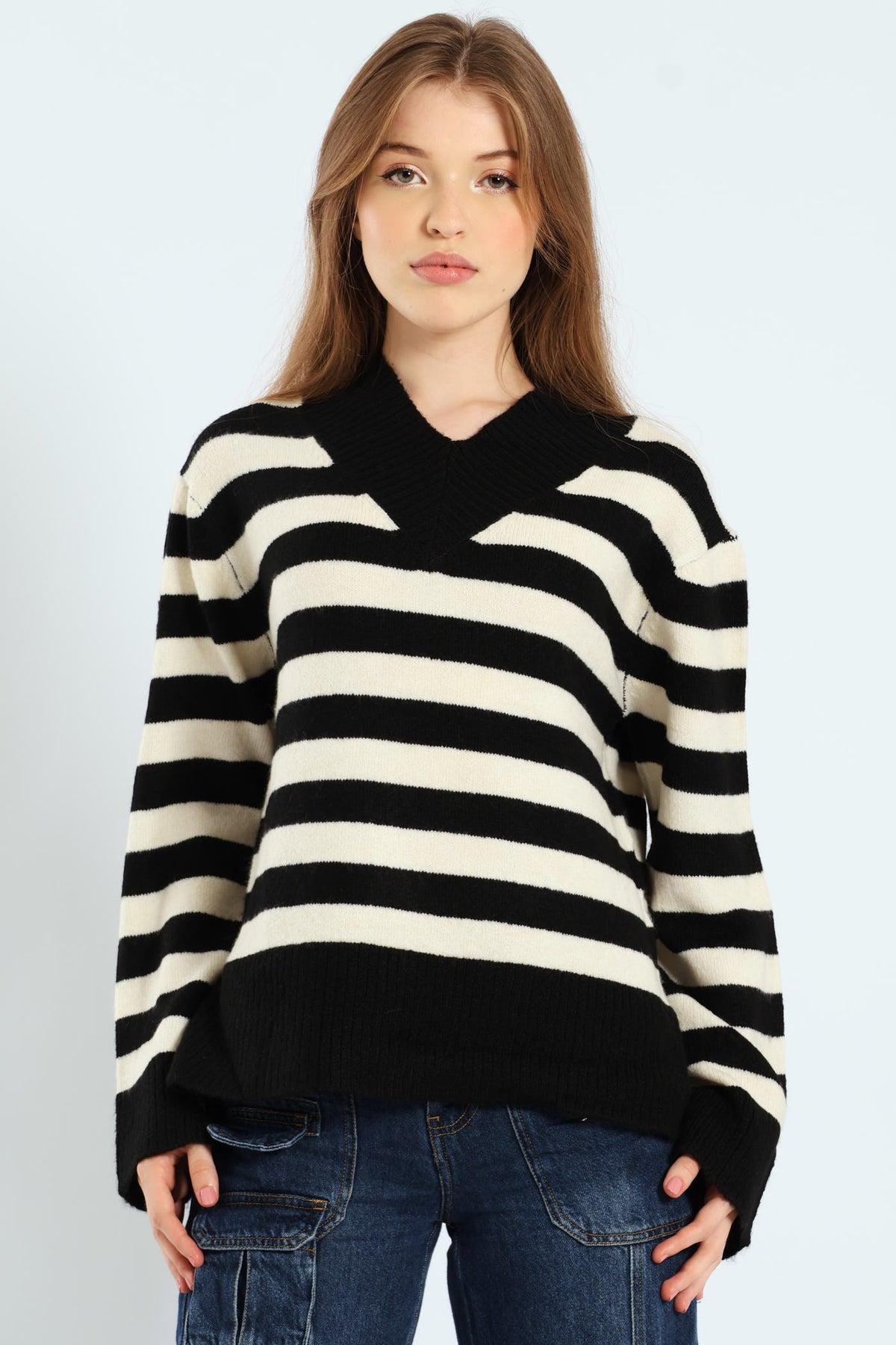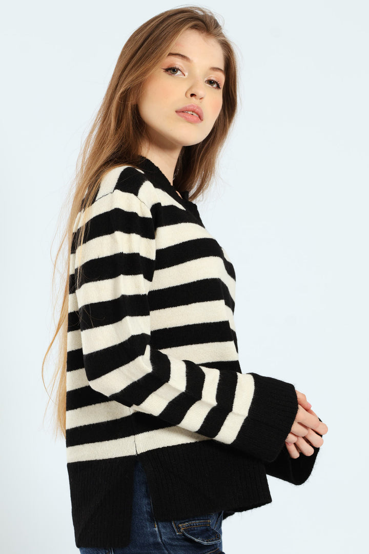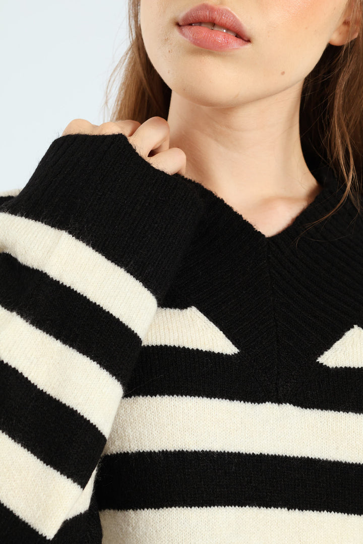 V-Neck Boxy Stripe Pullover - Black/Cream