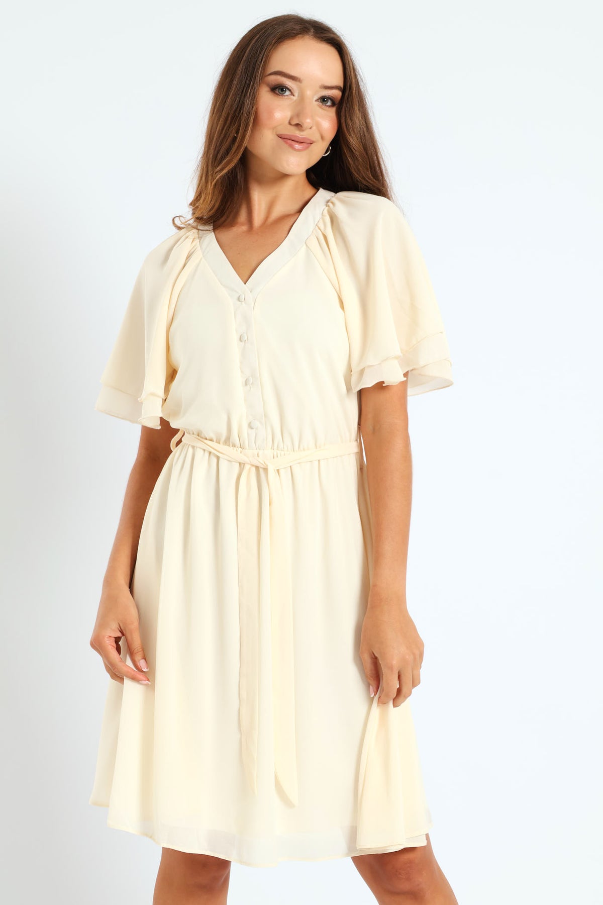 V-Neck Flutter Sleeve Belted Tea Dress - Cream