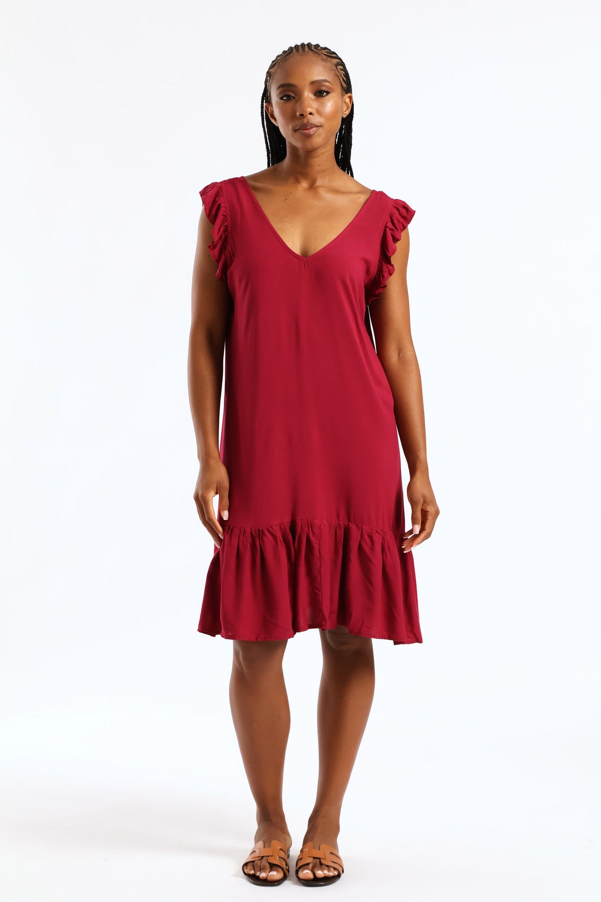 V-Neck Frill Sleeve Tie Detail Drop Hem Mini Dress - Beet