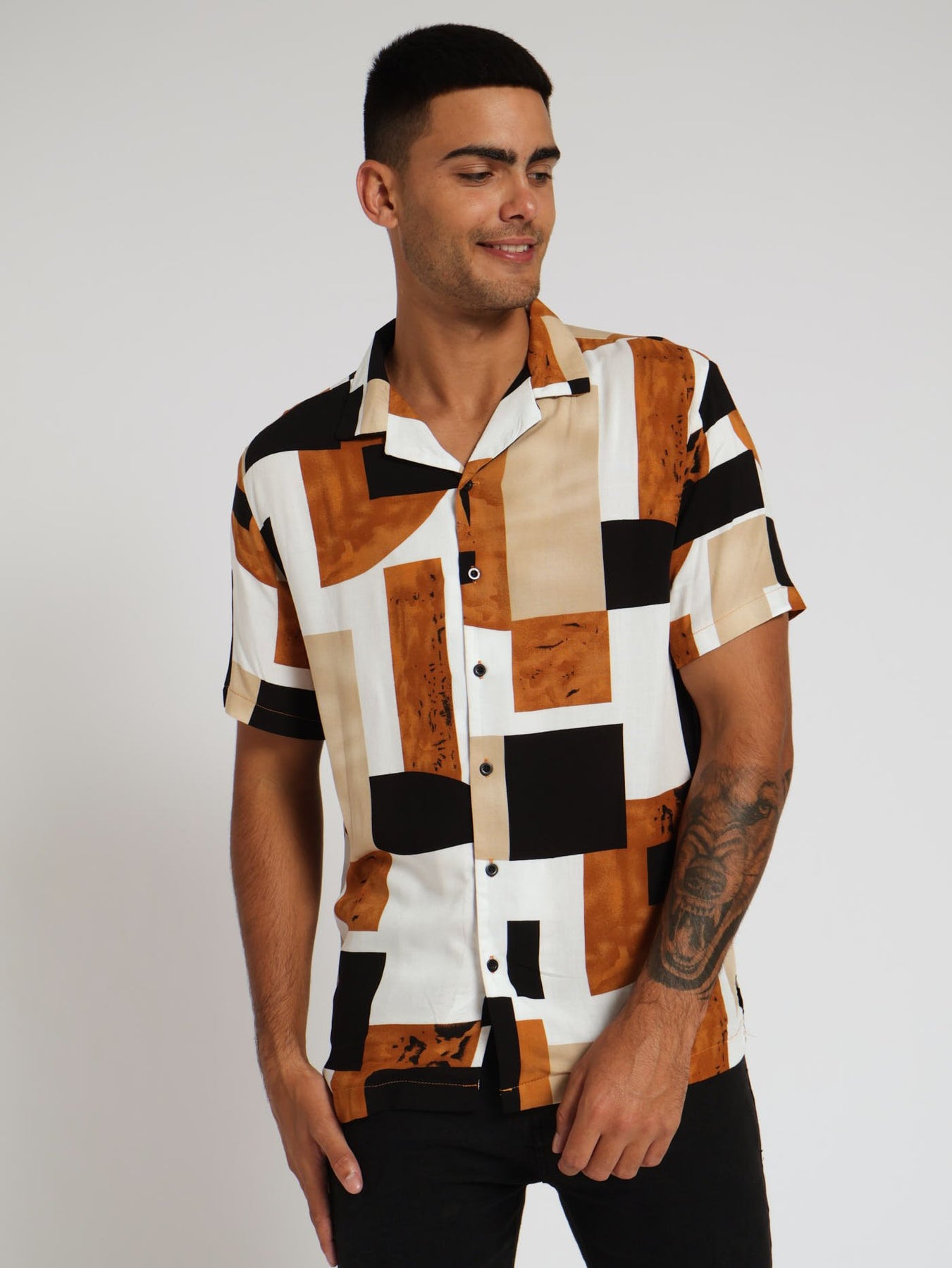 Viscose Abstract Block Print Shirt - Brown