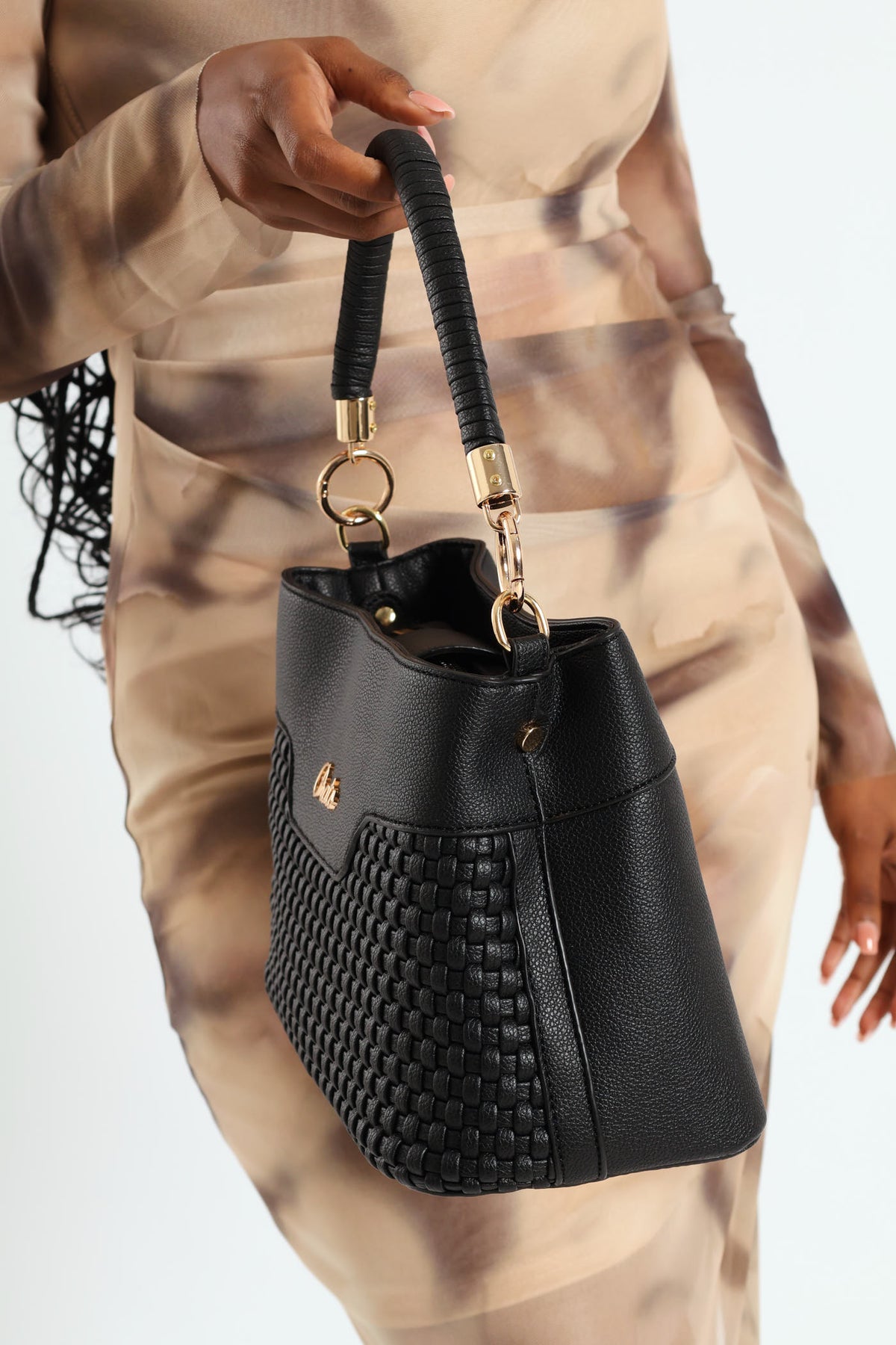 Woven Top Handle Bucket Bag - Black