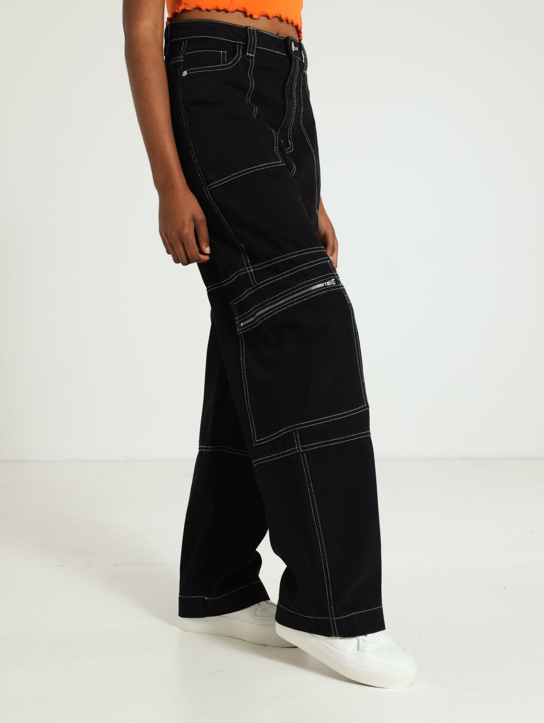 Zip Contrast Stitch Cargo Denim Jeans - Black