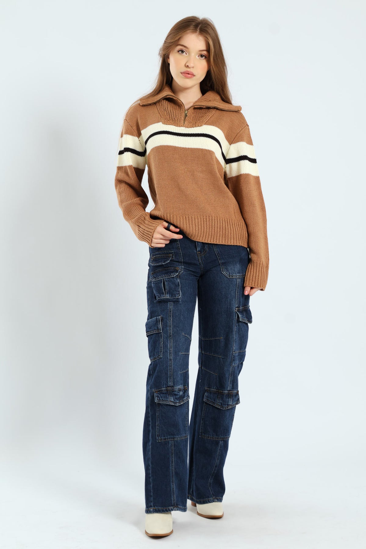 A knit sweater featuring contrasting striped accent, dropped long sleeves, ribbed trim, and a half-zip closure.